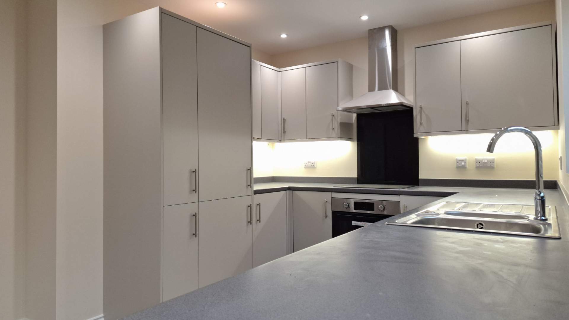 A large room for entertaining with two uPVC triple glazed windows looking on to the rear aspect of the property. There is a mixture of floor and wall mounted cupboards with under cupboard lighting and integrated fridge/freezer. On your left when entering the room is the kitchen area with a stainless steel sink and a half with drainer positioned under the window. There is an integrated dishwasher and washer/dryer located under the sink. To the left of the window is the electric hob with splash back and a wall mounted extractor fan. The integrated low level electric fan assisted oven is below the countertop. There are 10 recessed ceiling lights in the kitchen and a pendant ceiling light in the lounge area, the whole room is finished with laminate flooring throughout.