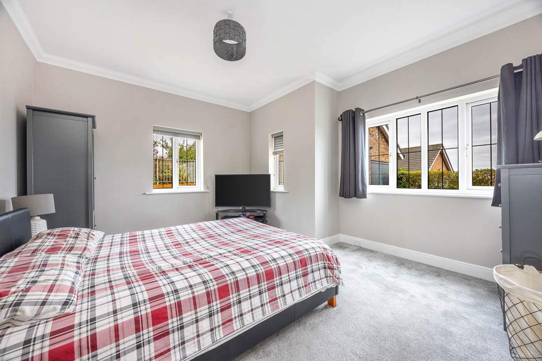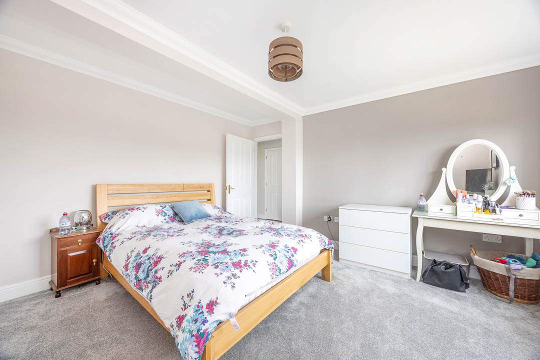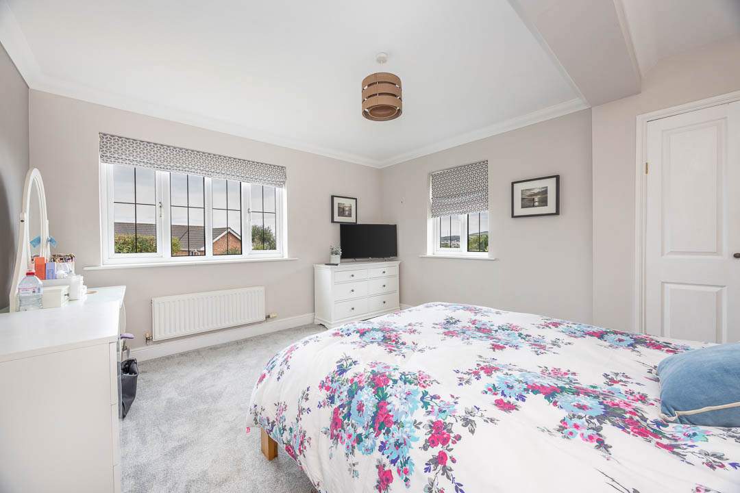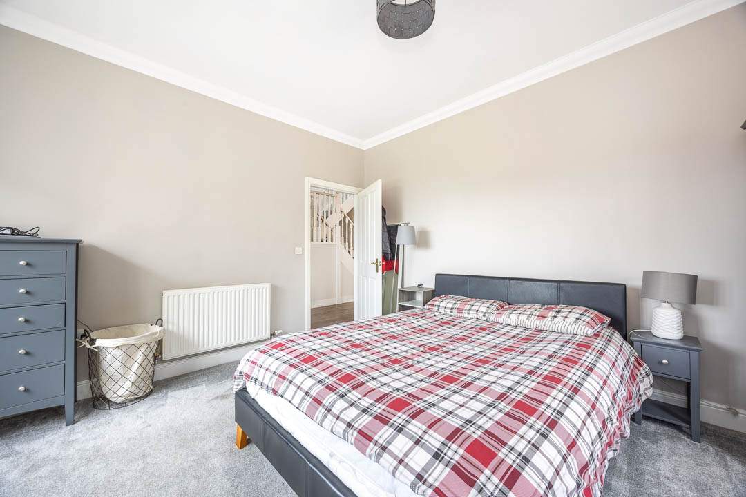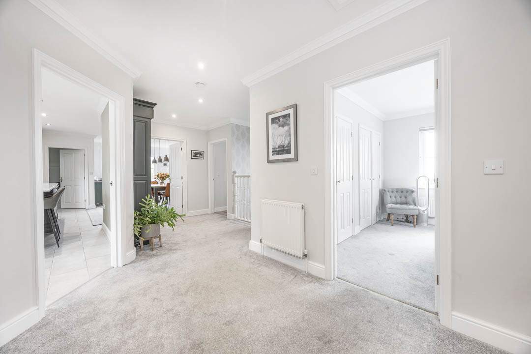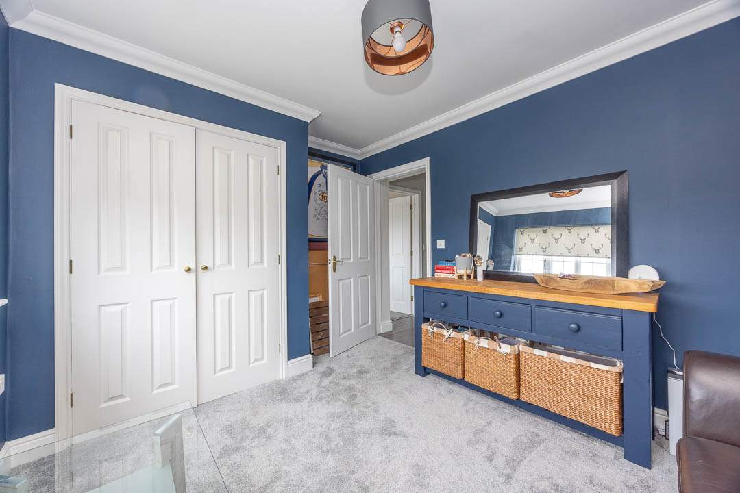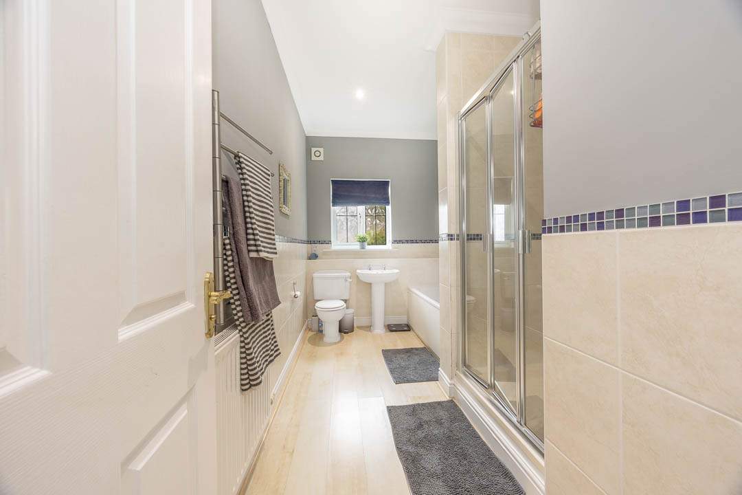 Entering the property via the newly fitted composite door which leads into the entrance porch with a door providing access to the u-shaped hallway with two built in storage cupboards. Off the hallway are Bedrooms 3, 4 & 5 all of which are good sized double bedrooms, Bedroom 4 & 5 both benefit from fitted wardrobes. Bedroom 3 is a lovely dual aspect room with plenty of natural light. In addition to the bedrooms, there is a potential 6th Bedroom, which is currently utilised as a gym, but would make a nice study/home office with French patio doors leading out to the south facing patio area. Lastly on the ground floor there is a family bathroom which has a panelled bath, walk in shower cubicle, wash hand basin and WC.