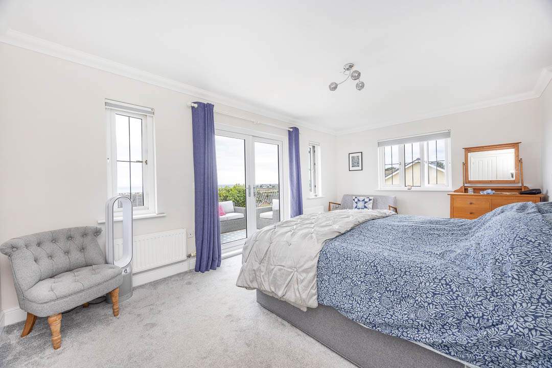 On the first floor there is a double glazed window over the stairwell offering plenty of natural light throughout the hallway. Off the hallway there is a door into a fantastic sized living room with dual aspect double glazed windows and sliding patio doors that lead out to sun terrace which enjoys panoramic sea and countryside views. The lounge features an open-fireplace with a stone surround and tiled hearth, and wood effect flooring that continues through to the excellently sized open-plan kitchen and dining area. The dining area has a window to the side aspect looking across the gardens and surrounding countryside. A large opening leads into the kitchen which has been recently modernised with soft grey base, wall and drawer units with marble worktops, a large central island with contrasting units and breakfast bar. Integrated appliances which include NEFF induction hob, double combi ovens (one with slide and hide door), plate warmer, fridge freezer and dishwasher. A set of French patio doors provide access out to the rear garden and a large double glazed window offers plenty of natural light. Off the kitchen is access into the utility room which is fitted with matching base units, large built in cupboard housing the pressurised hot water cylinder from the air source heat pump and space and plumbing for a washing machine, tumble dryer and space for an additional under counter fridge. Off the hallway there is a large guest cloakroom fitted with a wash hand basin and WC, and a large built in airing cupboard off the hall. Bedroom 1 and 2 are situated on the first floor, Bedroom 1 is situated to the front of the property enjoying panoramic views out to sea and access onto the private sun terrace via a set of double glazed French patio doors, dual aspect windows offer plenty of natural light and a bank of fitted wardrobes to one wall. In addition to the fitted wardrobes there is a walk through wardrobe which is fitted with two double wardrobes, one to either side, and then leads through to the en-suite bathroom which has been recently modernised and fitted with a double ended bath, wet room style shower, wash hand basin with vanity unit below and WC, tiled floors, underfloor heating and part tiled walls. Bedroom 2 is a large suite with a fitted wardrobe, dual aspect windows and an en-suite shower room fitted with a walk in shower, wash hand basin and WC