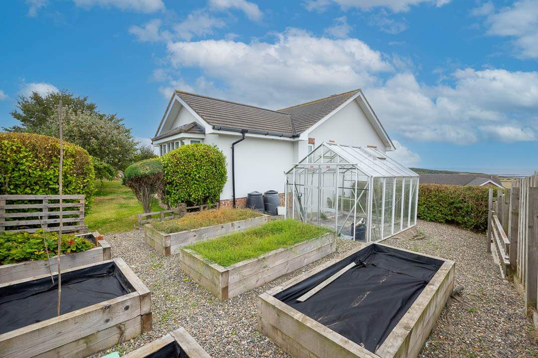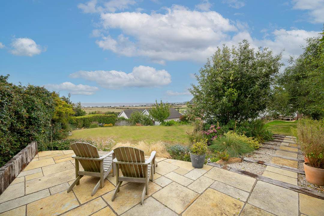 Externally, the property sits in a fantastic plot with beautifully maintained and mature gardens with fenced borders to the rear and hedgerow boarder siding onto the agricultural fields. The garden is mainly laid to law with a selection of patio and terraced areas, one directly off the kitchen and another on the lower level off the gym/Bedroom 6. Raised corner patio takes in those stunning views out to sea, raised vegetable beds and a greenhouse. There is a detached double garage with two newly fitted roller doors, to the rear of the garage there is a log store and attached covered storage area.