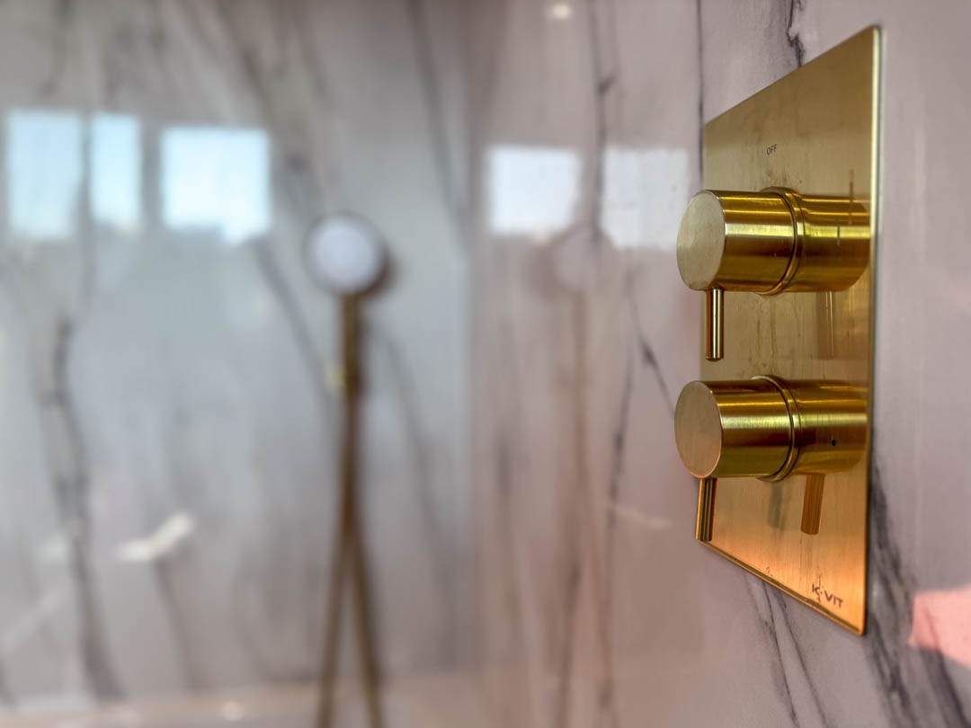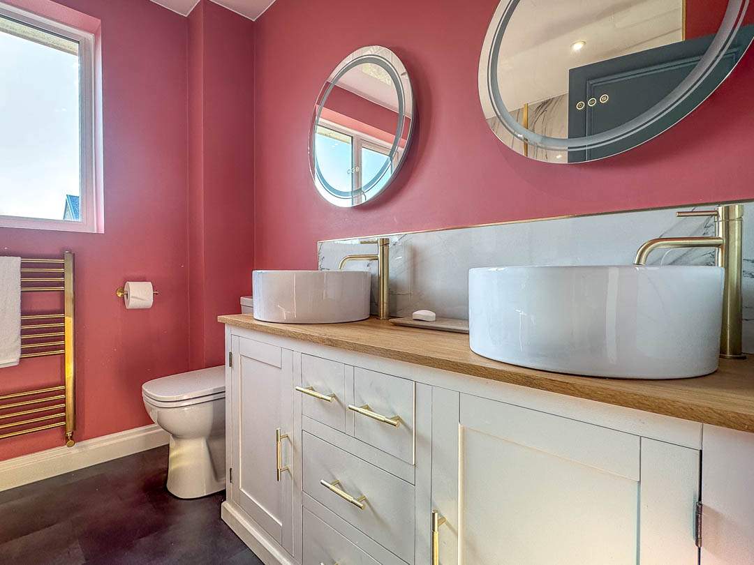 On the first floor is a bright landing with a double glazed window to the side aspect providing natural light. There a three large double bedrooms, bedroom 2 and 3 are situated to the rear and enjoy views across the rear garden. Bedroom 1 is situated at the front of the property and features a picture window with views out to sea and a set of fitted wardrobes. In addition to the bedrooms there is a recently fitted family bathroom with ‘His’ and ‘Hers’ wash hand basins sat on a vanity unit with two wall mounted LED mirrors, P-shaped panelled bath with shower over and WC, gold fixtures and fittings.