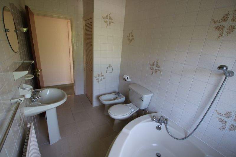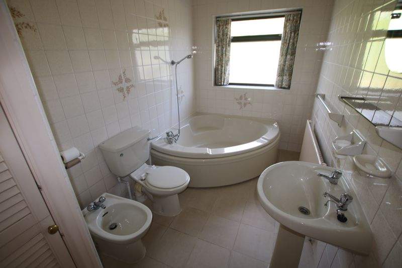 Suite comprising large corner bath with shower attachment, w.c., bidet, wash hand basin. Fully tiled walls and floor. Airing cupboard.