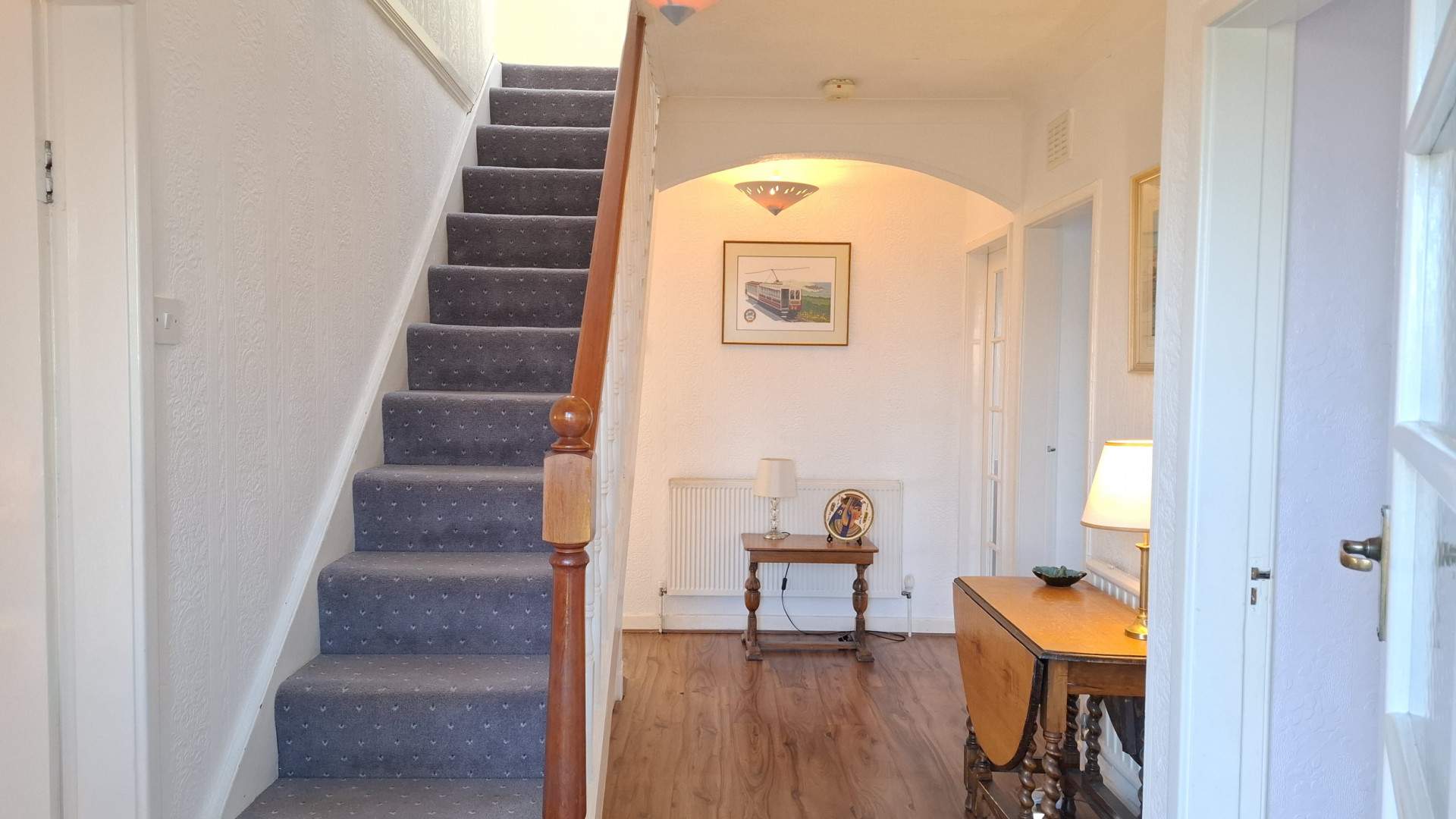 Spacious bright hallway with the lounge on your left at the bottom of the staircase to the first floor. Bedroom one is on your right with the snug room and dining room doors beyond. At the end of the hallway is the main bathroom for the property with a door on your left which leads into the kitchen. There are two storage cupboards located under the stairs. The stairs to the first floor are carpeted with a wooden banister, the hallway is finished with two ceiling lights and wood effect laminate flooring throughout.