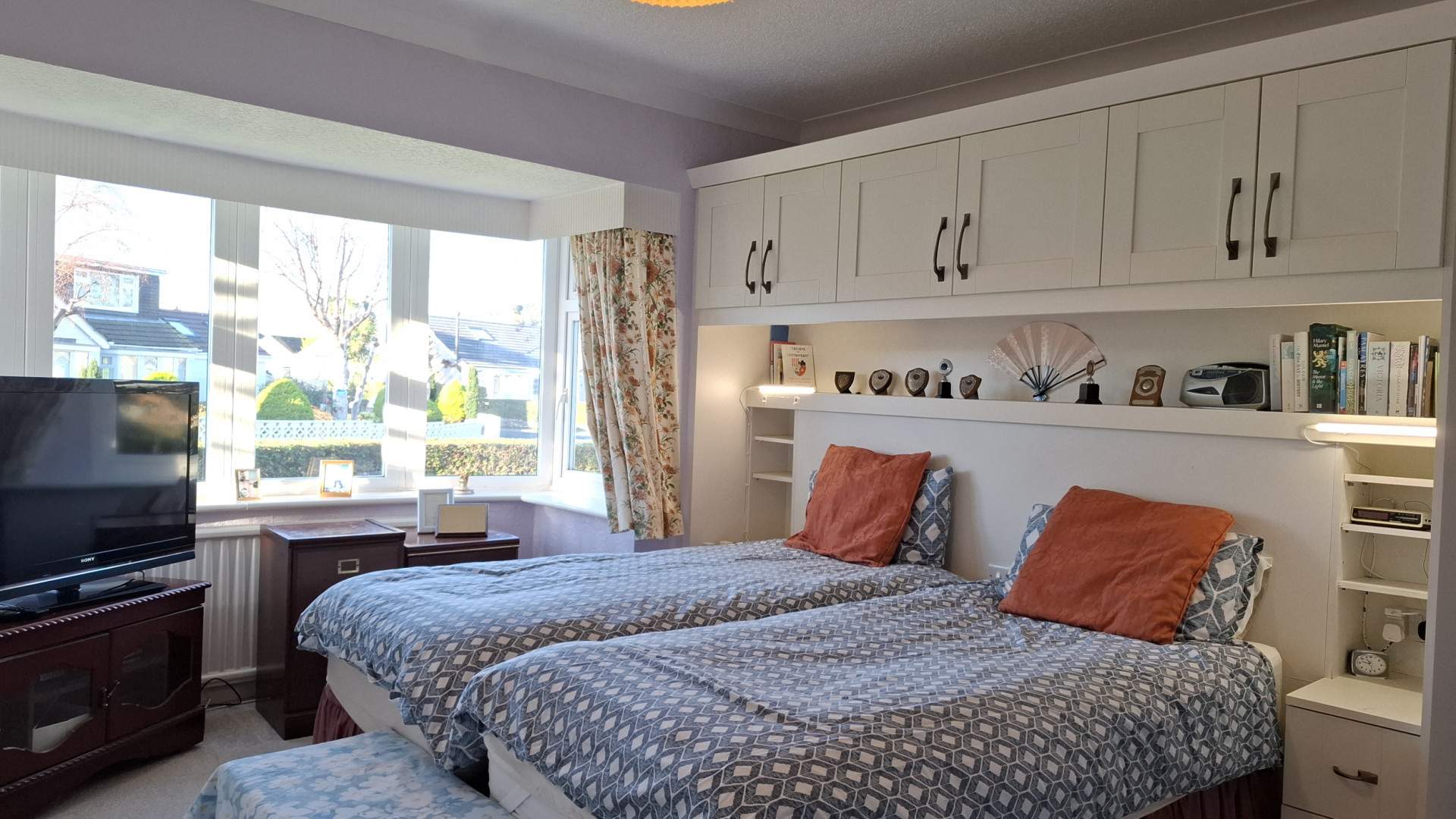 A large double bedroom with a uPVC double glazed bay window looking on to the front aspect. There are built in wardrobes the length of the wall ahead of you when entering the bedroom. Behind the door is a fitted unit which incorporates bedside tables with a shelf and storage cupboards positioned above the bed. The bedroom is finished with a ceiling light and carpeted flooring throughout.