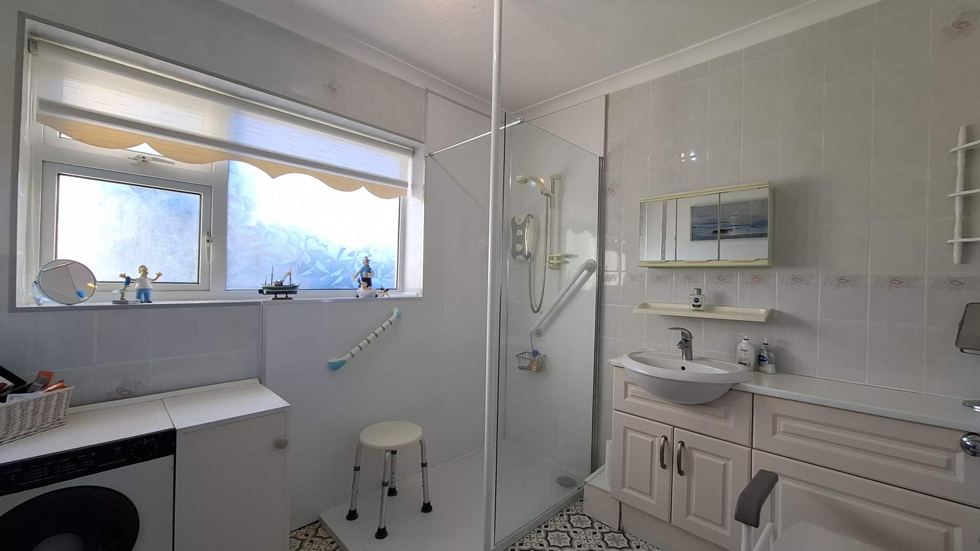A bright airy bathroom with a uPVC double glazed frosted window on to the rear aspect. To the right of the window is an Mira electric walk in shower with a mermaid board surround. To the right of the shower is a vanity unit with sink and WC. There is a double cupboard below the sink for storage, a wall mounted shelf above and a further wall mounted triple cupboard. The bathroom is finished with a ceiling light and linoleum flooring throughout.
