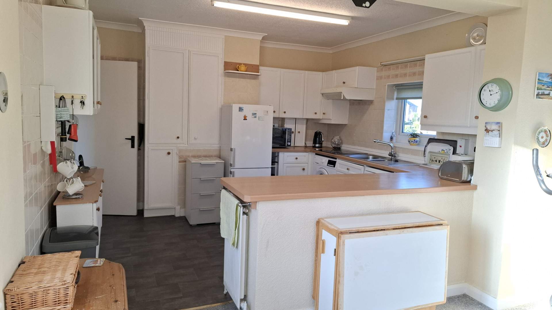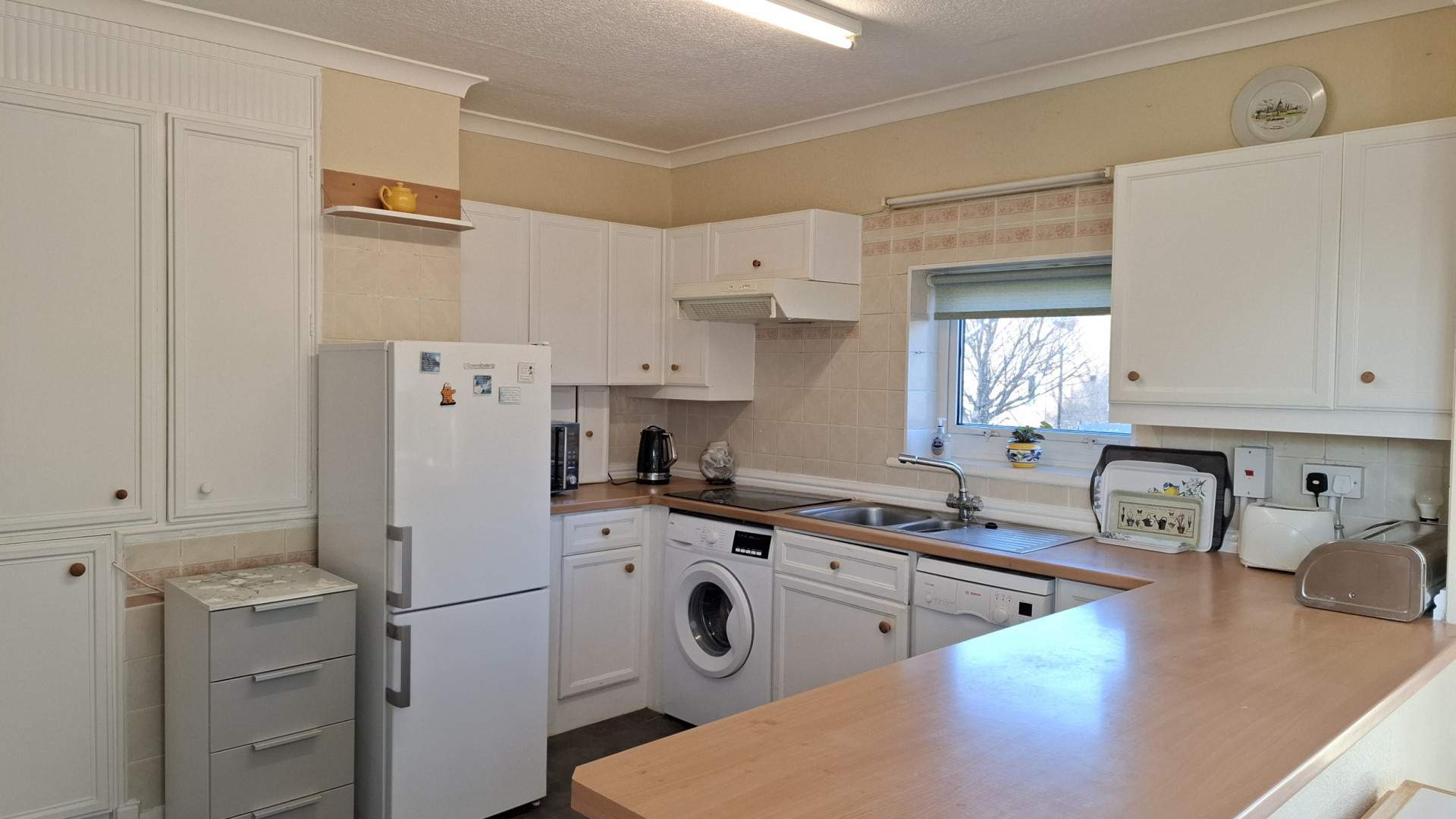 Fitted with a blend of floor and wall mounted white cupboards finished with a wood effect worktop. When entering the kitchen there is a double cupboard which houses the hot tank for the property. Positioned on the same wall as the uPVC double glazed window providing views on to the side aspect is the 4 ring Indesit hob with extractor above and stainless-steel sink and a half with drainer. Below the worktop is a Logik standalone washing machine and a standalone slimline Bosch dishwasher. Further cupboards create a breakfast style bar which has the AEG oven under the worktop with further storage either side. There is space for relaxing in the conservatory area beyond the breakfast bar which has four uPVC double glazed windows and a set of uPVC double glazed doors opening on to the rear aspect. The kitchen has a ceiling light and is finished with linoleum flooring with the conservatory having recessed down lighters and carpeted flooring throughout.