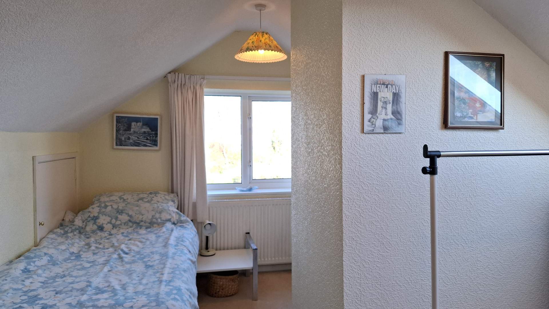 A spacious double bedroom with a Velux window providing views to the rear aspect and a uPVC double glazed window with views across Ramsey to the Mountain. There is under eaves storage on both sides of the bedroom. The bedroom has a ceiling light and carpeted flooring throughout.
