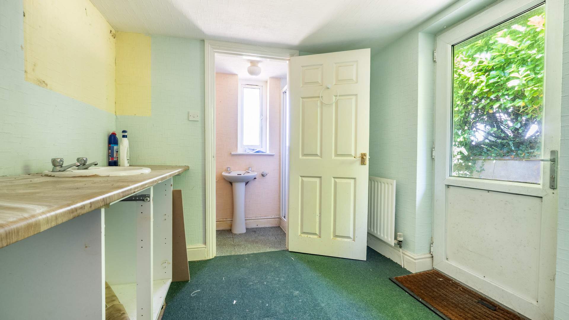 - Kitchenette (approx. 9’9 x 7’5): Work surface incorporating a sink. uPVC double glazed door providing access to the side of the property.