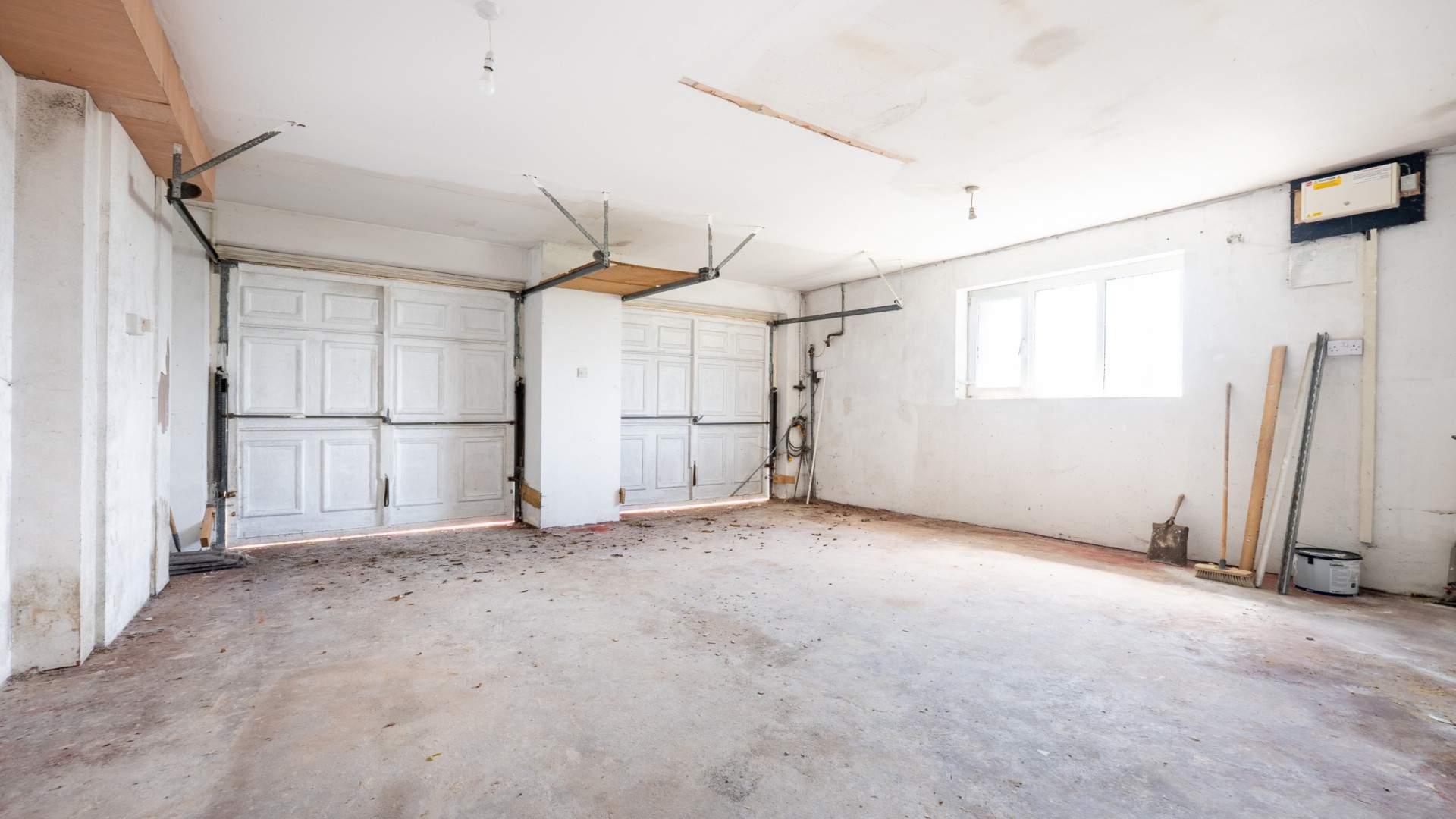 Fitted with two up and over garage doors. Firebird oil fired central heating boiler. Modern electric fuse box, fitted in recent years. Water tap. Power and light connected.