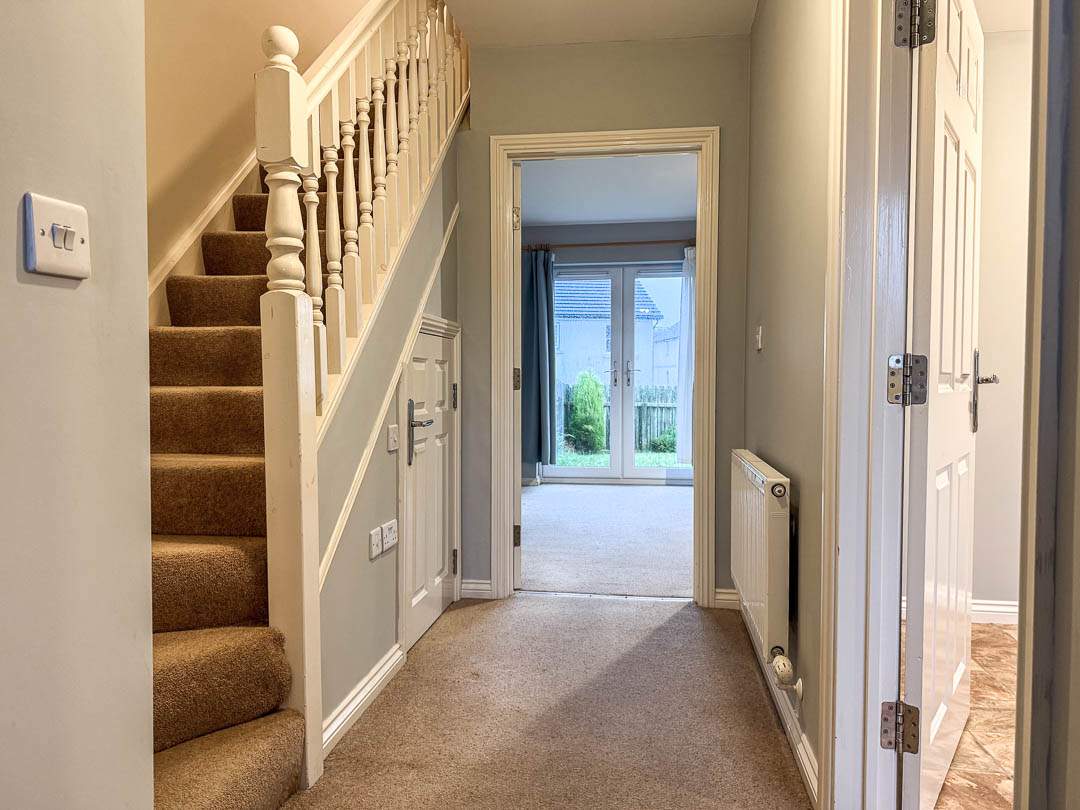uPVC double glazed door provides access into the entrance hall with an understairs storage cupboard and carpeted stairs to the first floor. Off the entrance hall is the downstairs WC which has a double glazed window, wash hand basin and WC. To the front of the property is the kitchen diner which is fitted with a range of beech effect base and wall units with laminate worktops, integrated electric oven and four ring gas hob, fridge freezer, space for a washing machine and tumble dryer. uPVC double glazed window to the front aspect enjoying the rural aspect. Gas combination boiler. Lastly off the entrance hall is a door into the lounge which stretches across the back of the property, it is an excellent sized living space with a double glazed window overlooking the rear garden and a set of French patio doors leading out.