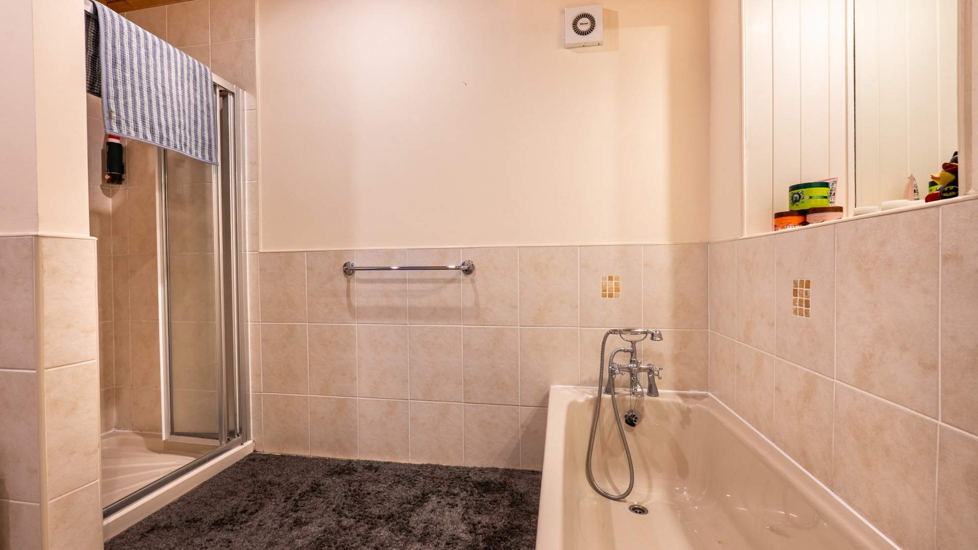 Fitted with a four piece suite comprising of a shower cubicle, bath tub, pedestal wash hand basin and W.C. Built-in cupboard. Shaver points. Extractor fan. Ceiling downlighters.