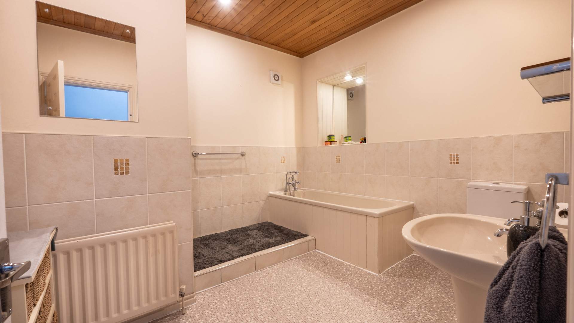 Fitted with a three piece suite comprising of a walk-in shower cubicle, pedestal wash hand basin and W.C. Radiator. Ceiling downlighters. Extractor fan. Fully tiled walls. Tiled flooring.