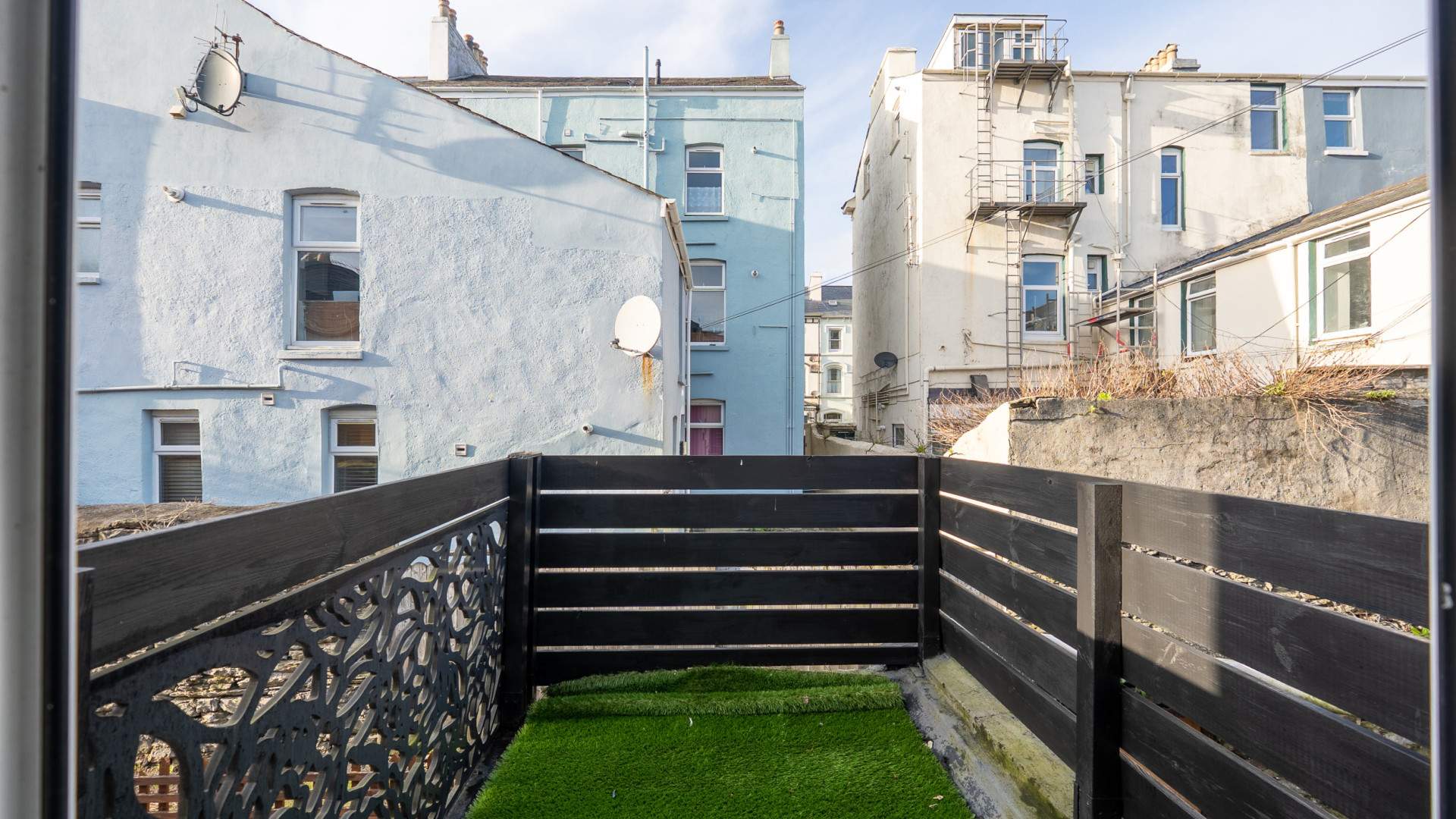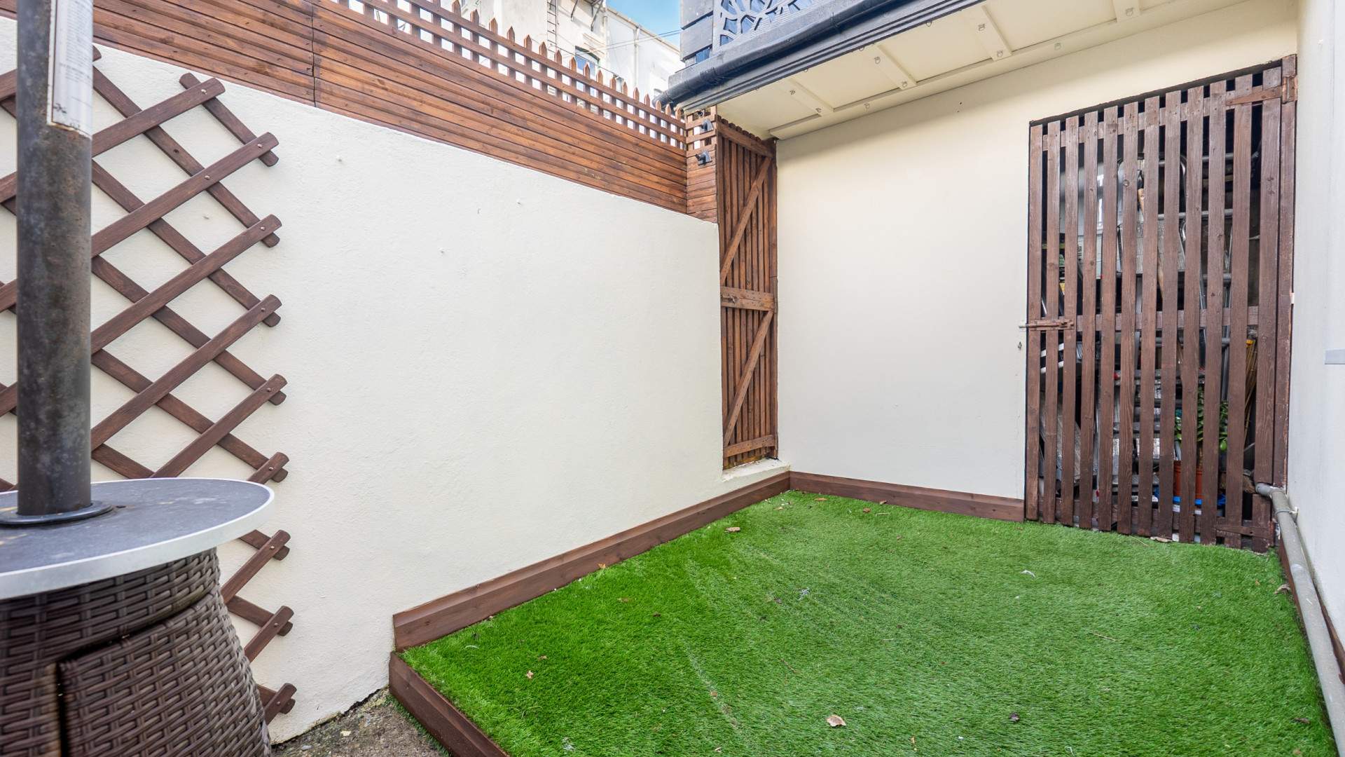 Terraced area with artificial grass and fenced boundaries, providing a sun trap in summer afternoons into the early evenings.