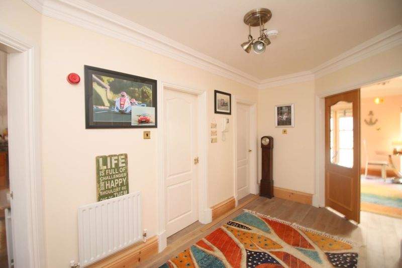 Coved ceiling. 2 x ceiling lights. 2 x radiator. Laminate flooring. Bell video entry intercom system. Separate cloaks cupboard with cloak hanging and shelving. Double wooden part glazed doors to;
