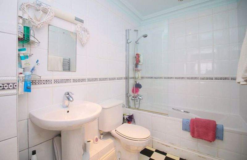 Modern white rocca suite comprising panelled bath with mixer shower over. Pedestal wash hand basin. WC. Fully tiled wall. Extractor fan. Lino flooring. Downlighters.