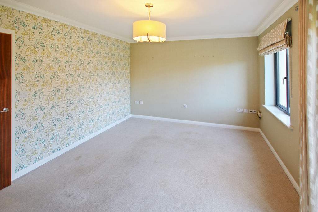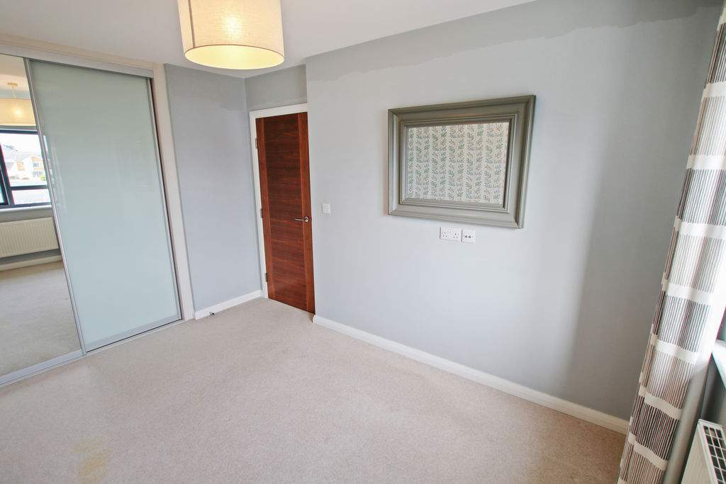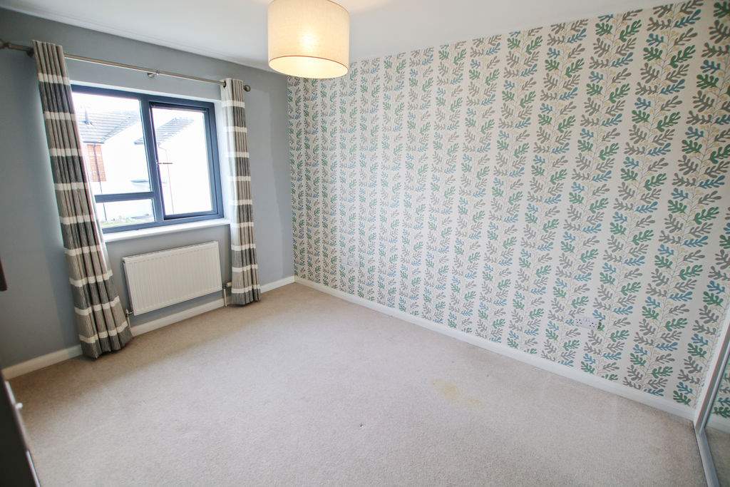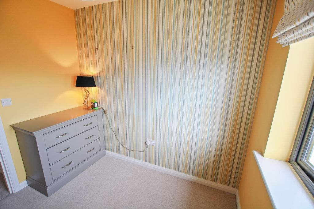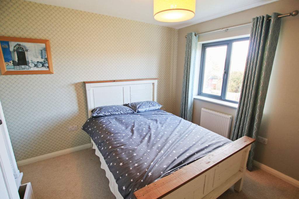 Rear aspect with pleasant views over garden. Freestanding wardrobe and matching double bed. Professionally fitted curtains.