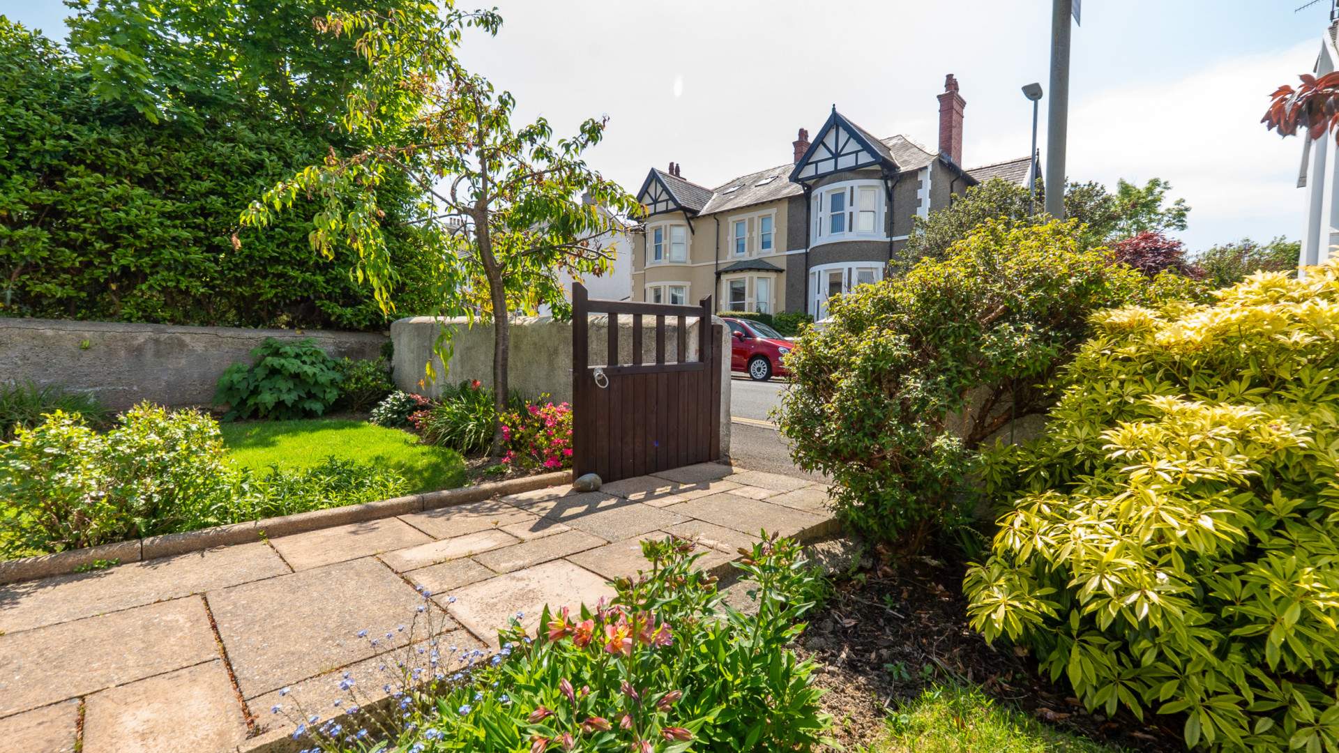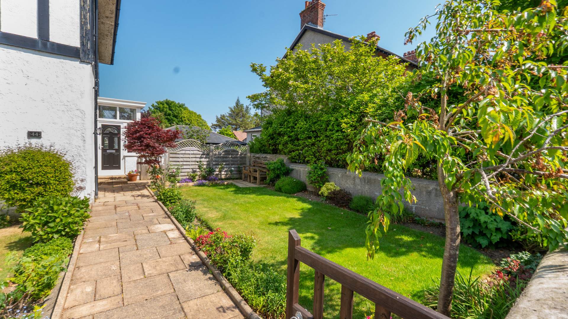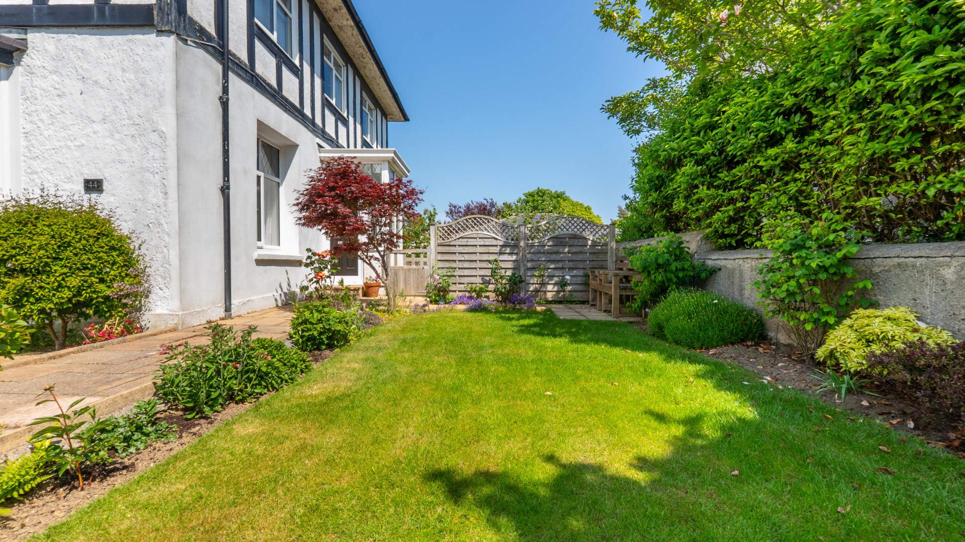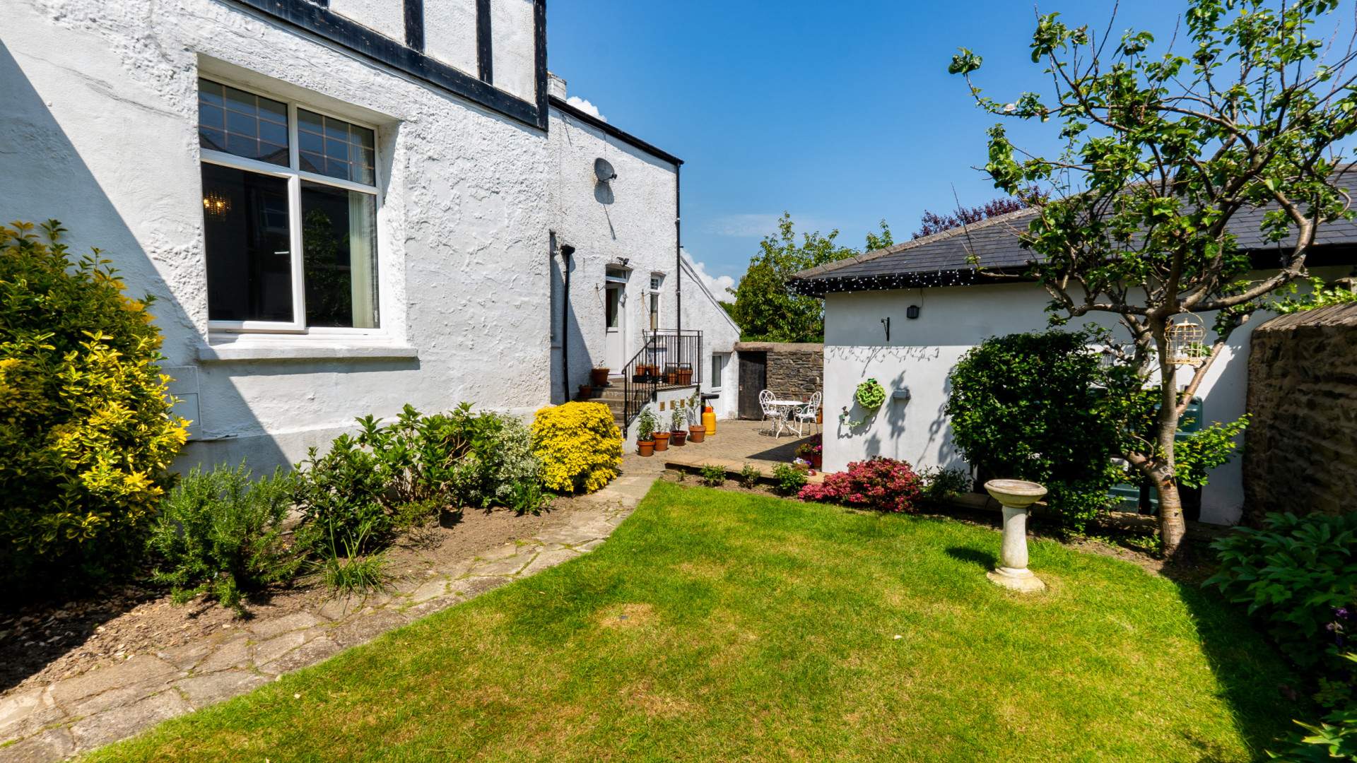 To the front of the property there are two immaculately maintained lawned garden areas with dwarfed walled boundaries and multiple mature shrubs, separated by a footpath leading to the front door. Gated access to the rear.