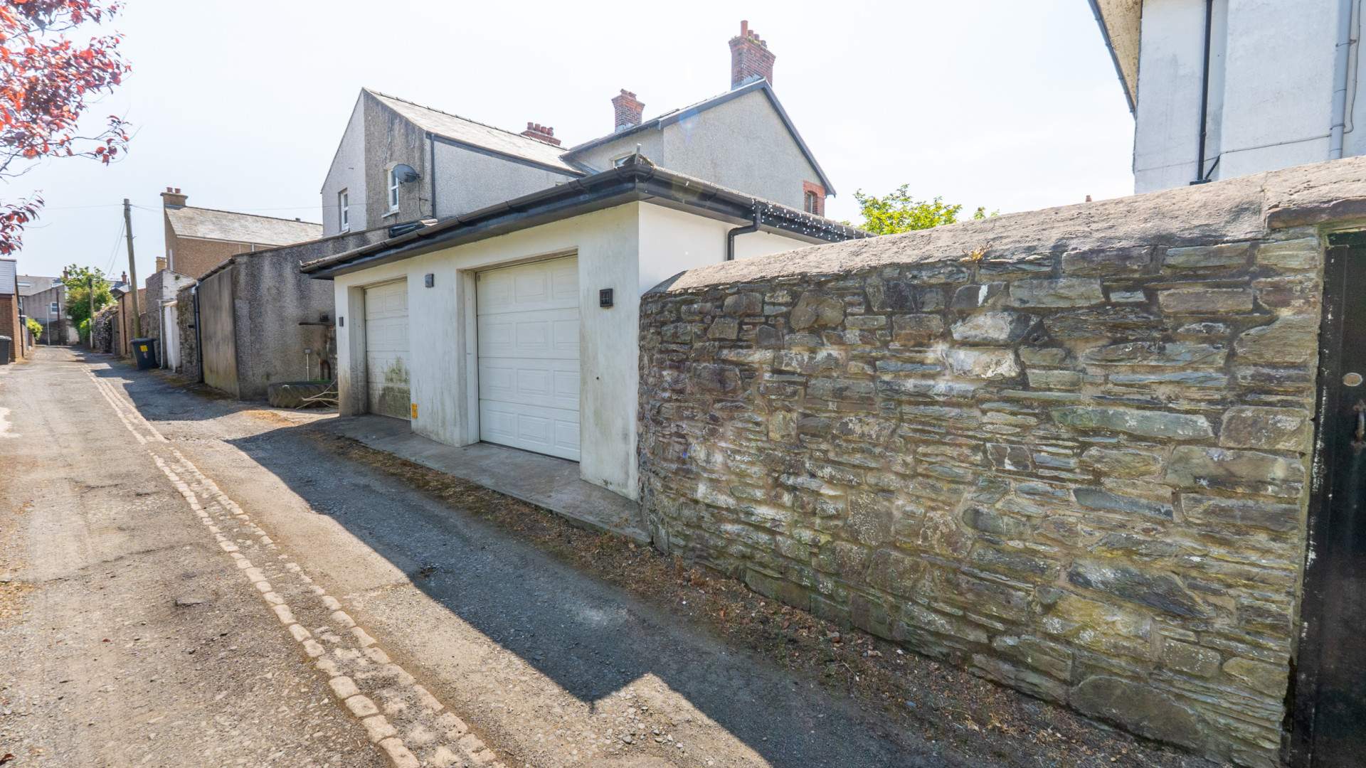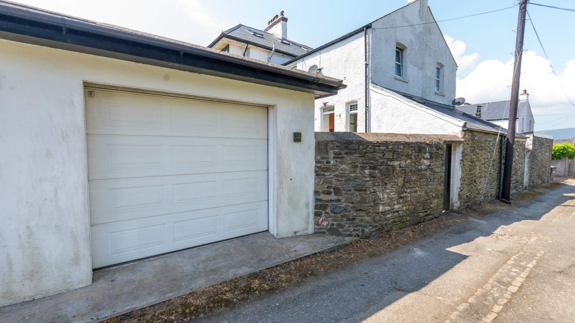 Fitted with a white sectional garage door and accessed from the rear service lane.