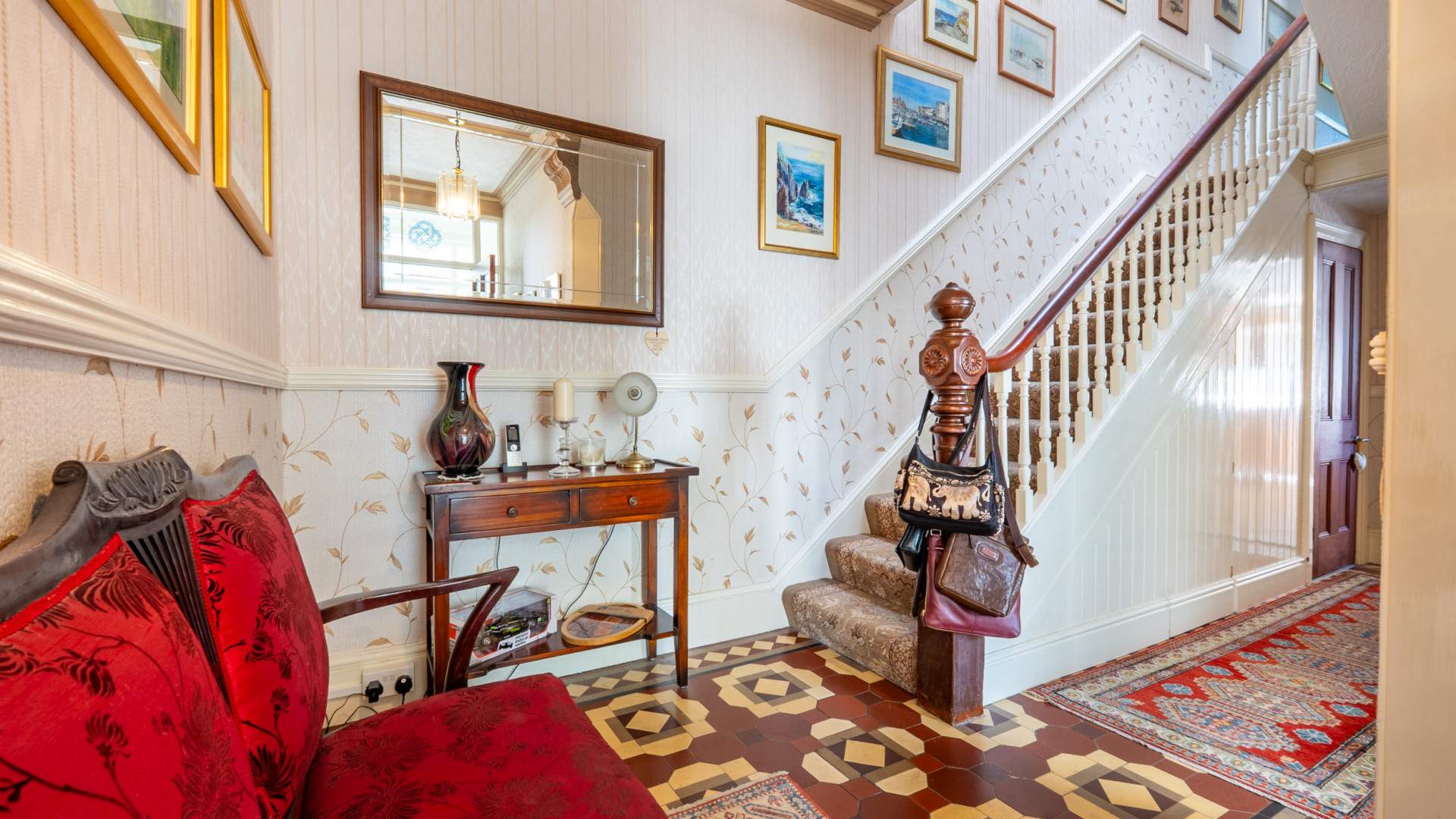 - Entrance Hallway (approx. 18’4 max x 14’6 max): Original tiled flooring