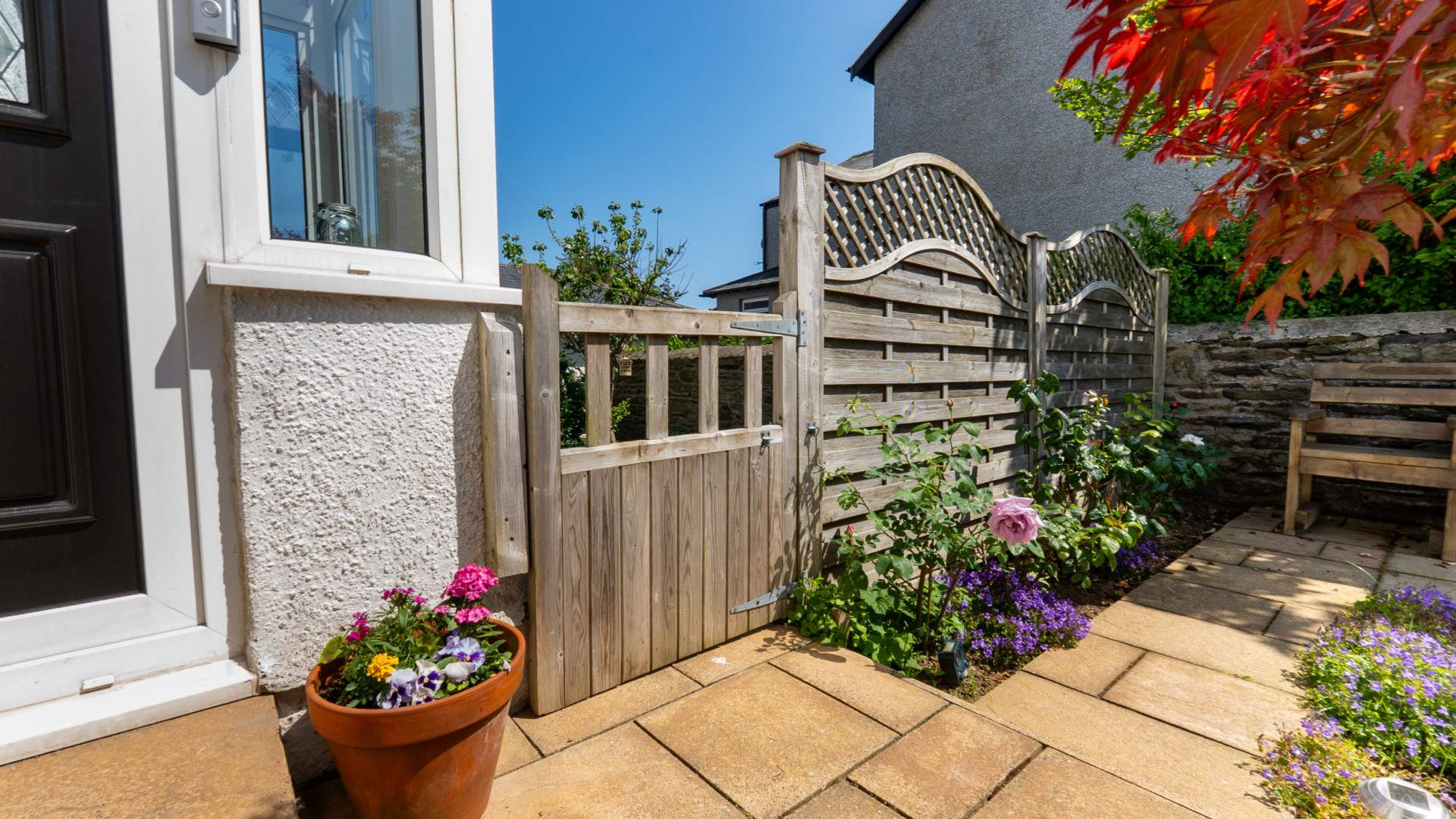 To the rear of the property there is a private and enclosed lawned garden with walled boundaries and a good size patio area. Footpath and steps leading to the kitchen. Gated access to the service lane. Door into: