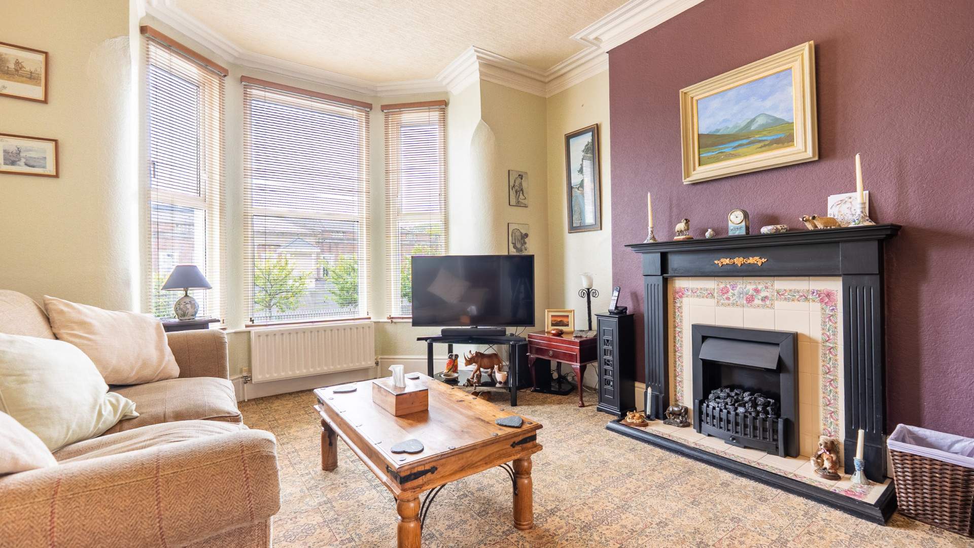 Feature electric fireplace with tiled surround and ornate hearth. uPVC double glazed bay window. Opening into:
