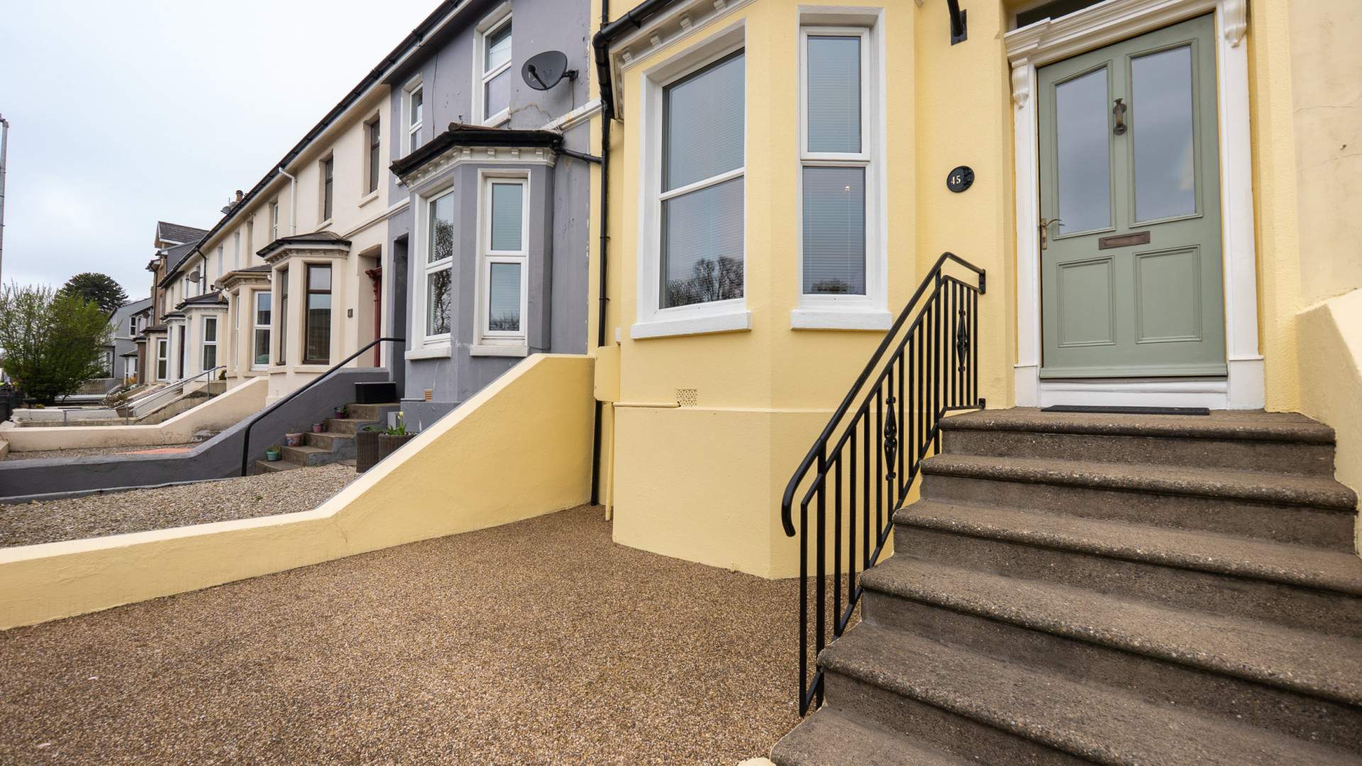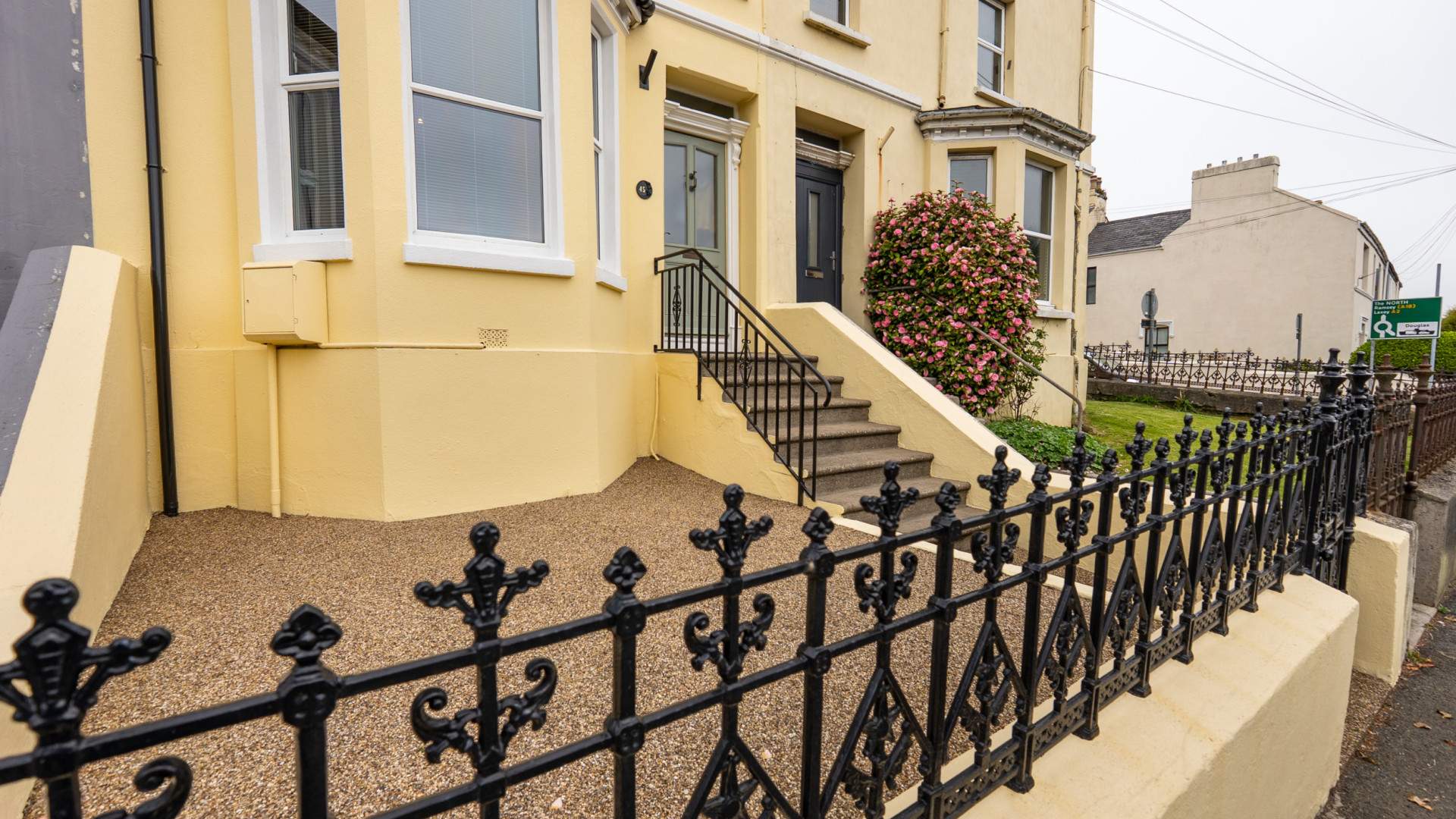 To the front of the property there is a well-maintained front yard, finished with a stone effect resin. Dwarf walled boundaries with wrought iron railings, a footpath and steps leading up to the front door.