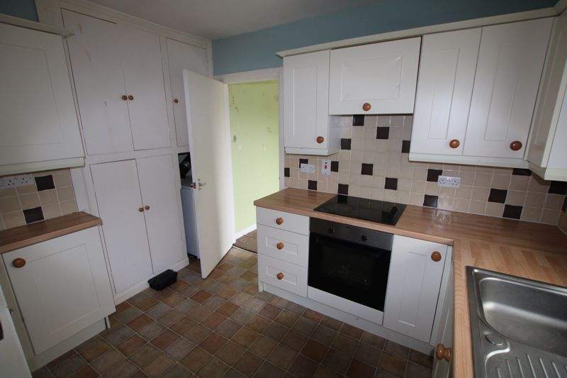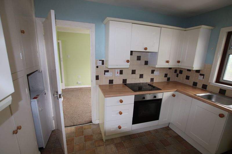 Good range of cream fronted wall and base units with contrasting worktops incorporating stainless steel sink unit, electric oven, ceramic hob, plumbing for washing machine, point for fridge/freezer. Built-in cupboard housing hot water tank. Oil central heating boiler. Door to: