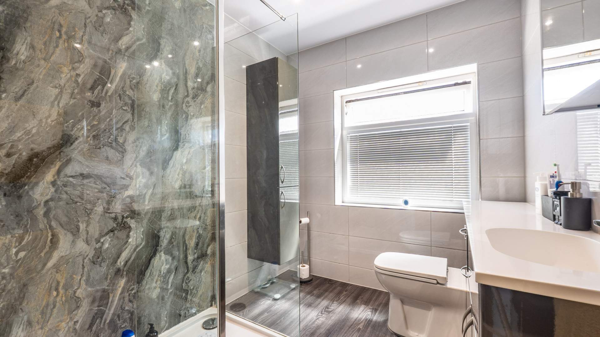 Fitted within the last 5 years with a modern three piece suite comprising of a walk-in shower with an overhead rainfall shower head and a separate flexi shower attachment, vanity wash hand basin unit and W.C. Heated towel rail. Frosted uPVC double glazed window. Extractor fan. Ceiling downlighters.
