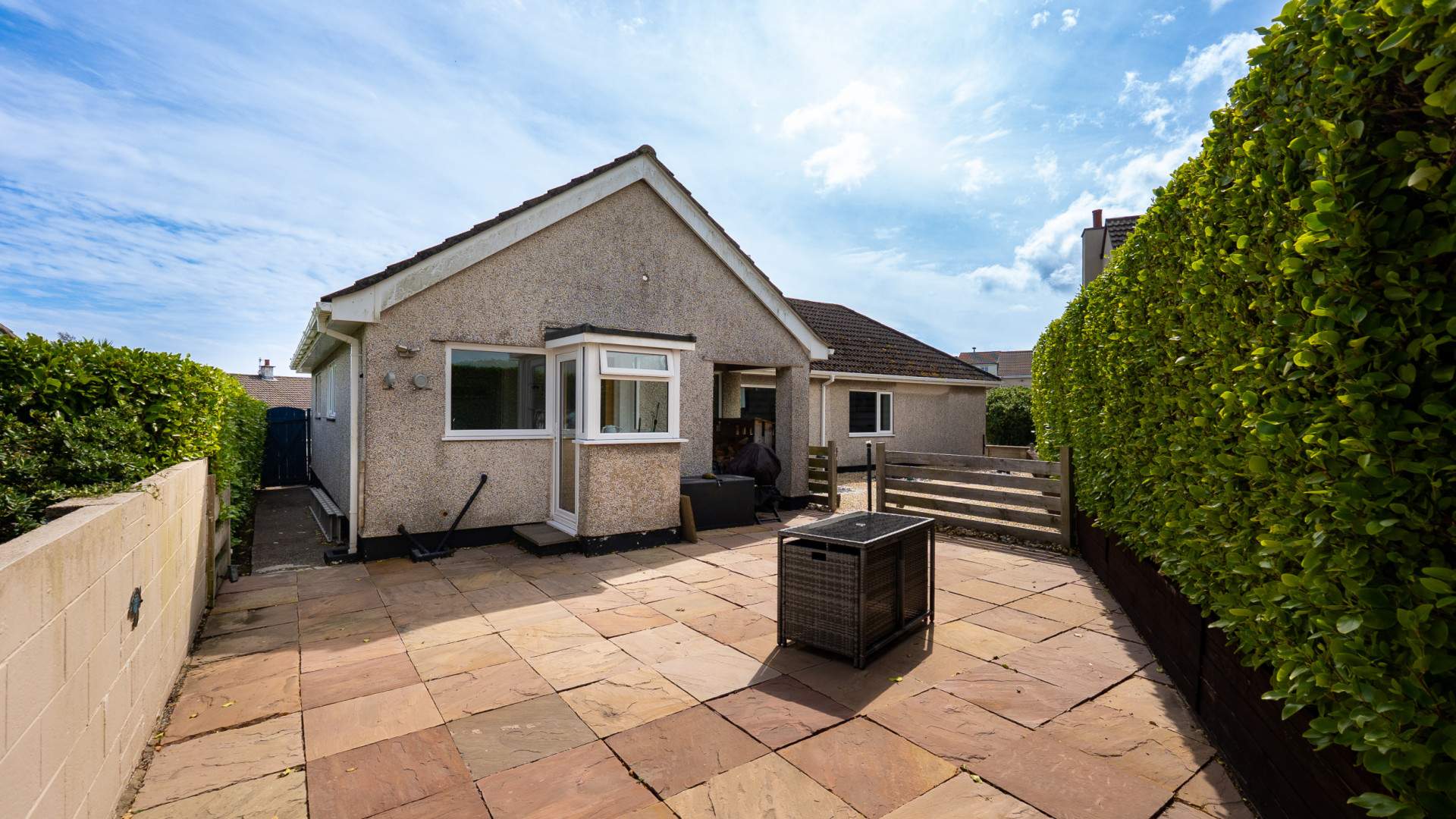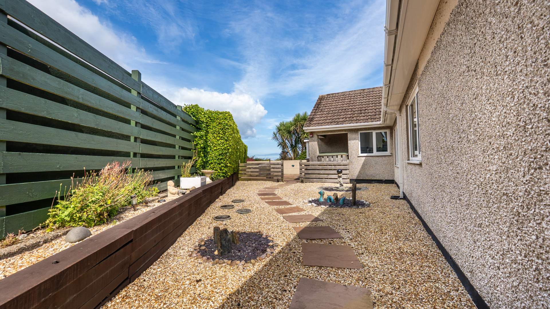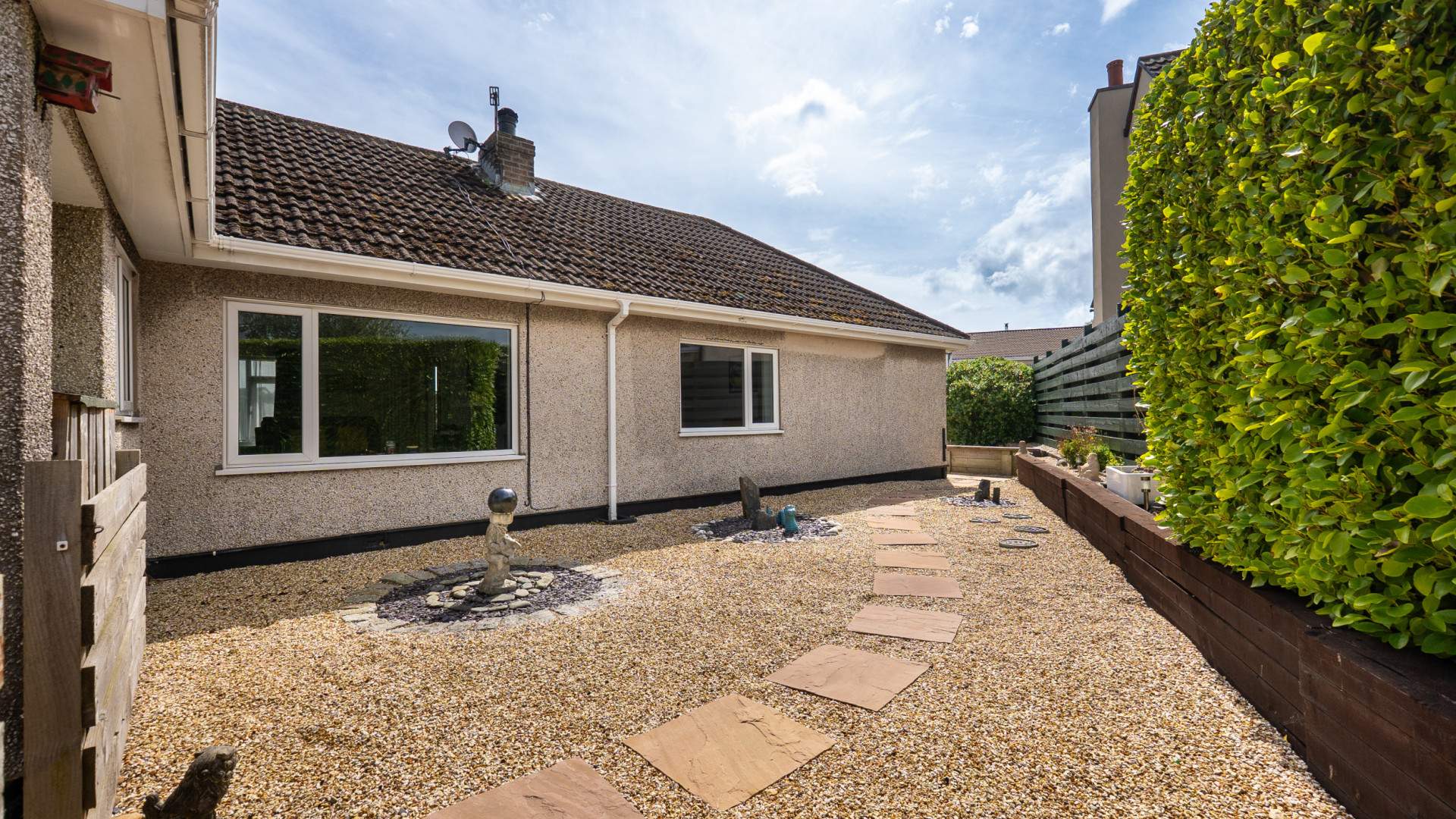 To the side of the property there is a gravelled area with hedged boundaries, a step-stone pathway and a raised gravelled area leading to the rear.
