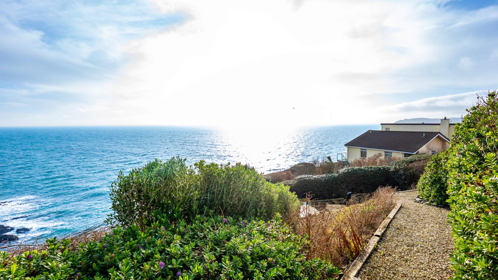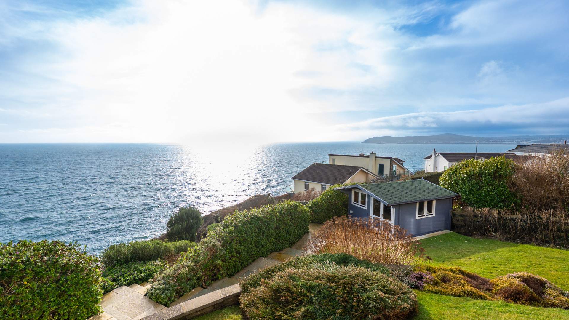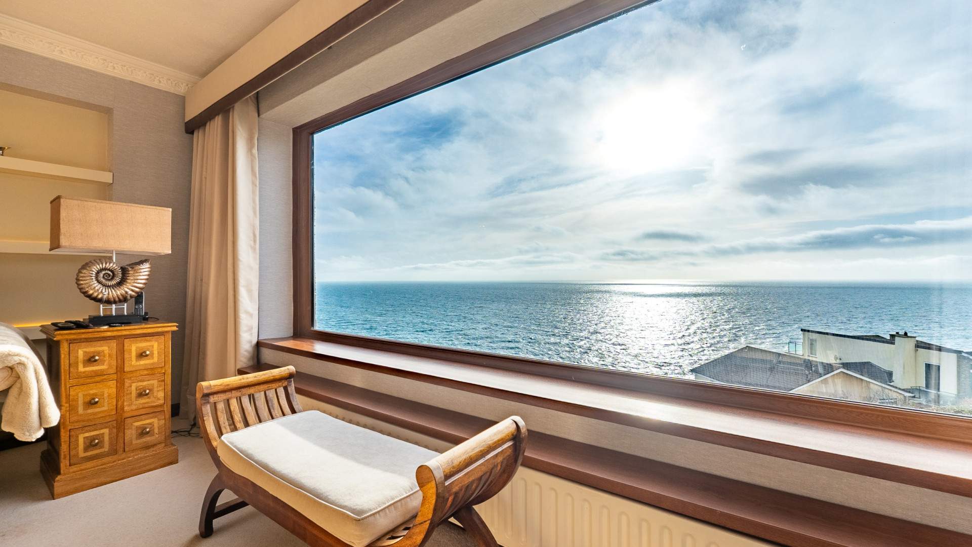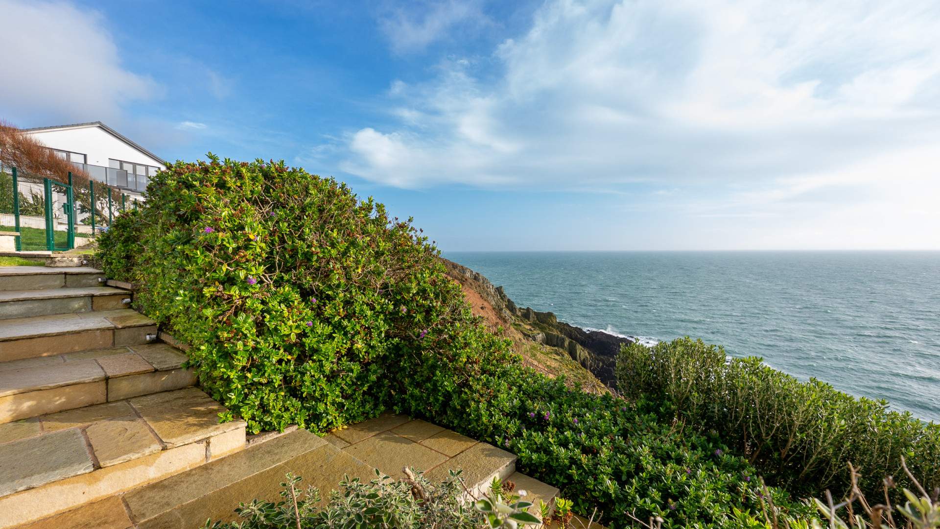 Outside, the home is framed by landscaped gardens designed for low‑maintenance enjoyment and year‑round appeal. The roof terrace, off the kitchen, offers an elevated vantage point to take in the sweeping sea views, perfect for entertaining.