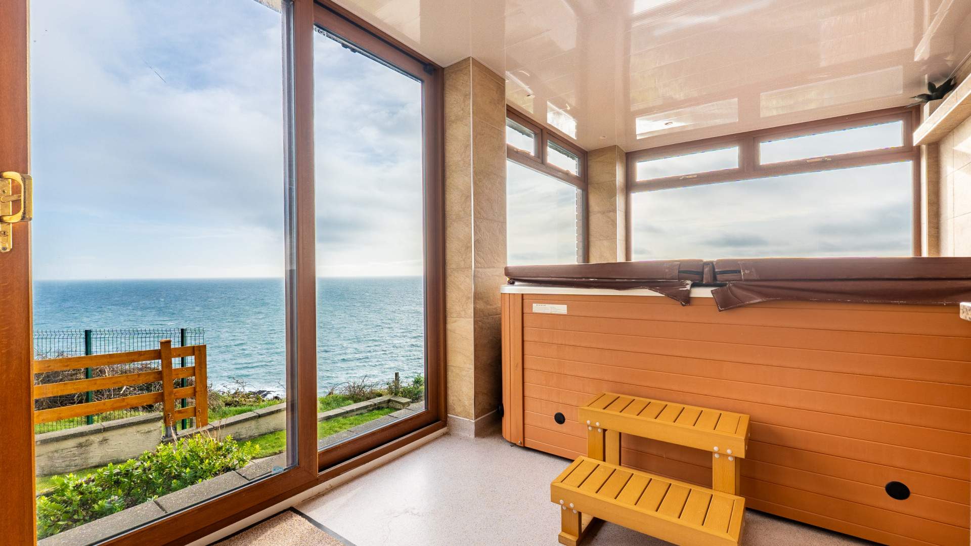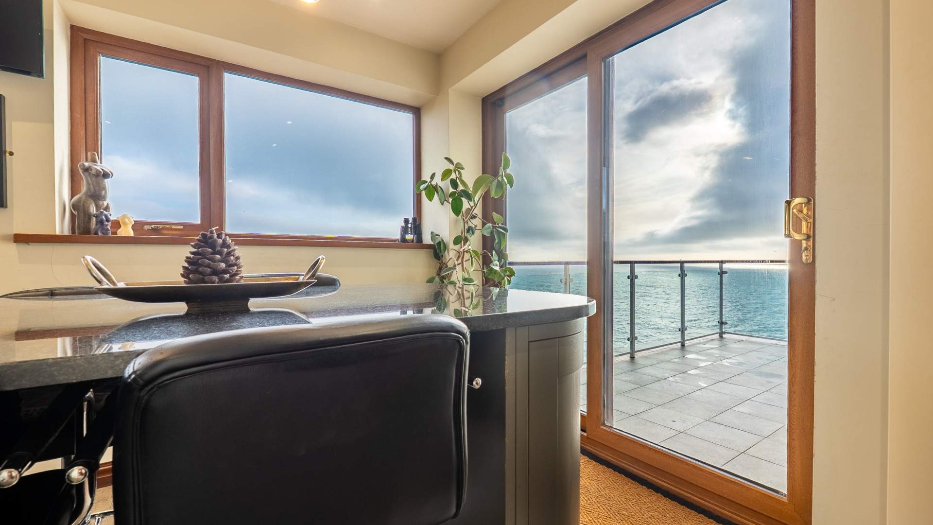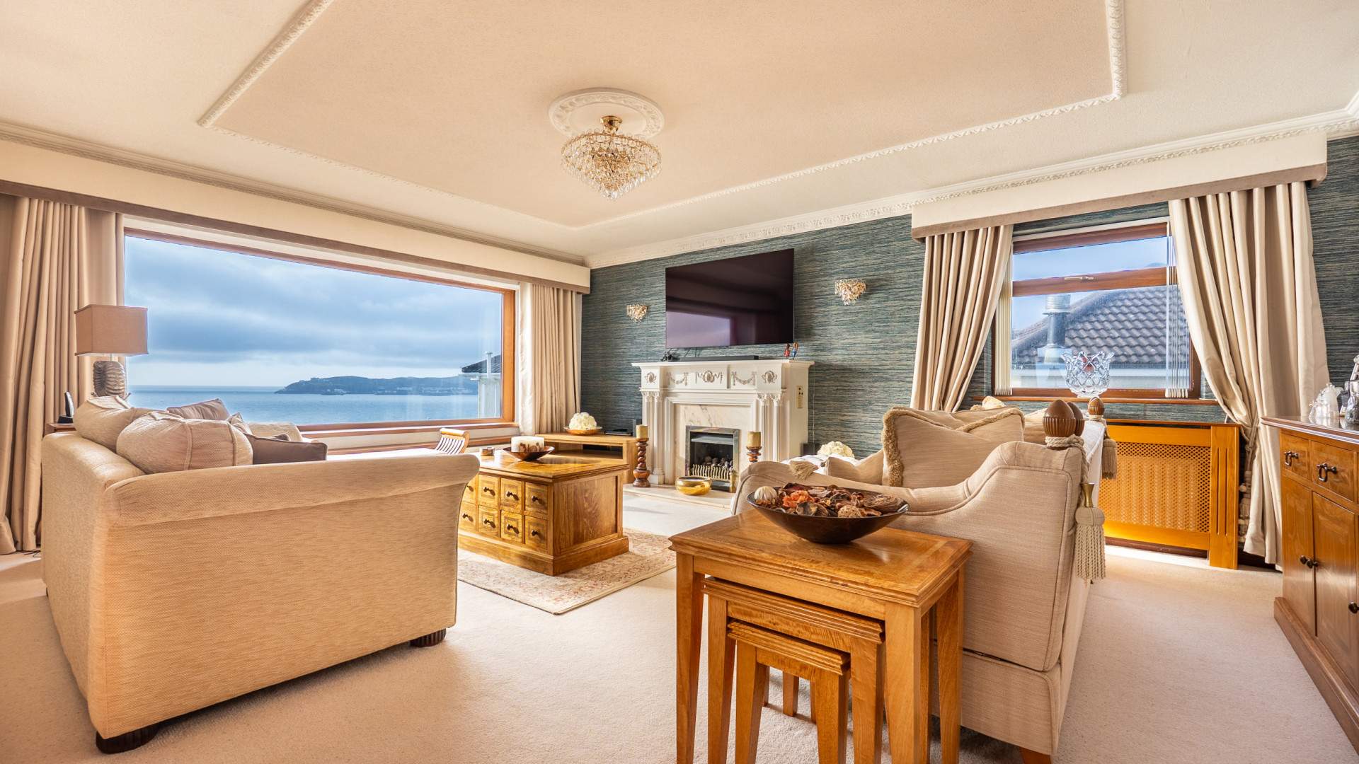 Outside, the home is framed by landscaped gardens designed for low‑maintenance enjoyment and year‑round appeal. The roof terrace, off the kitchen, offers an elevated vantage point to take in the sweeping sea views, perfect for entertaining.