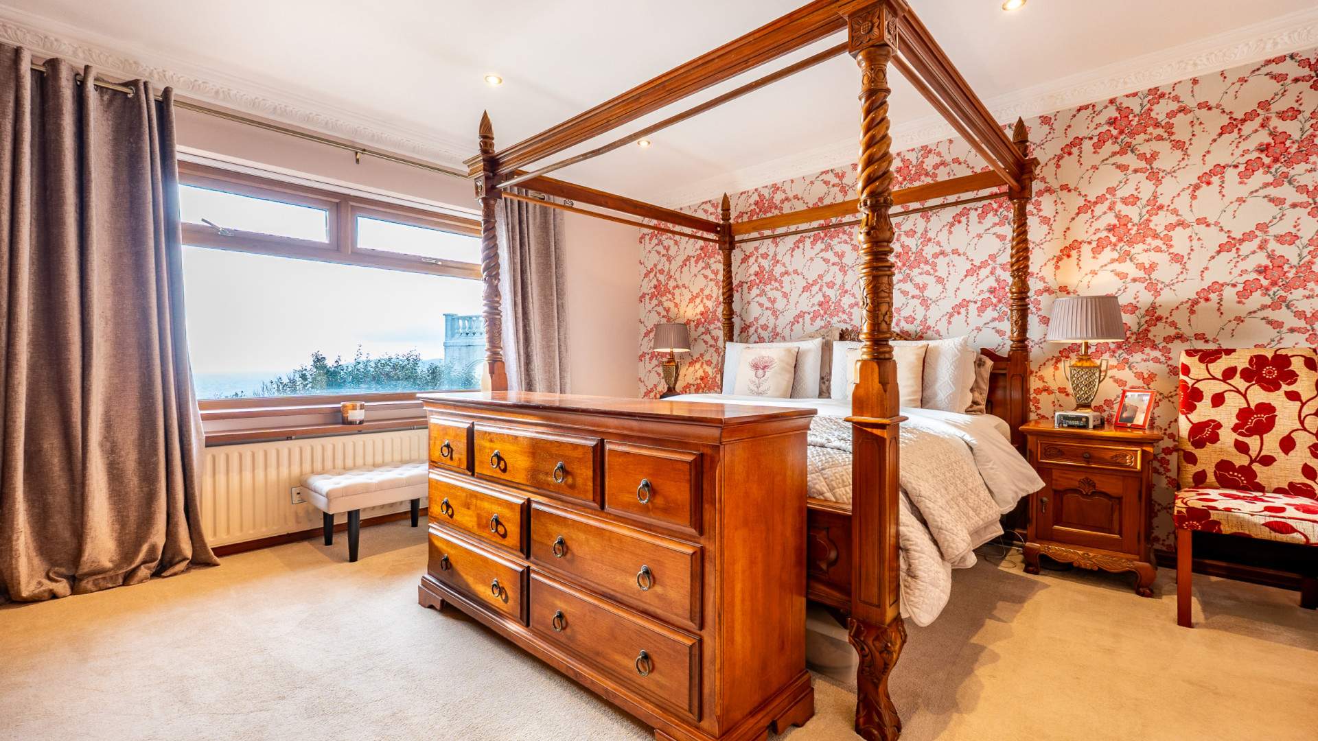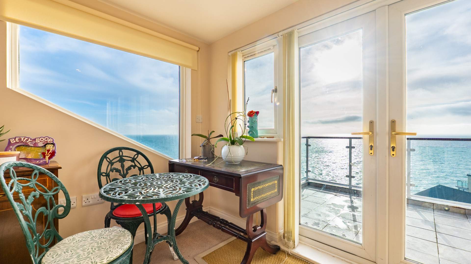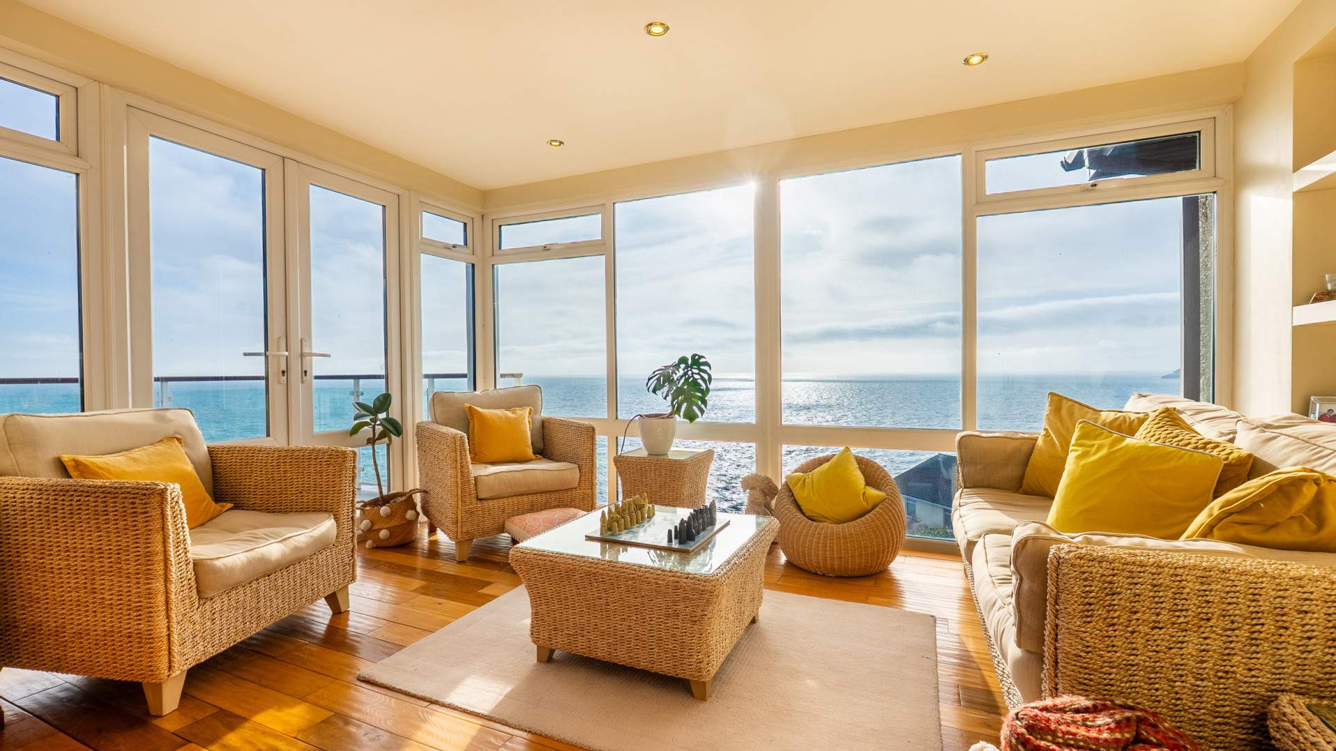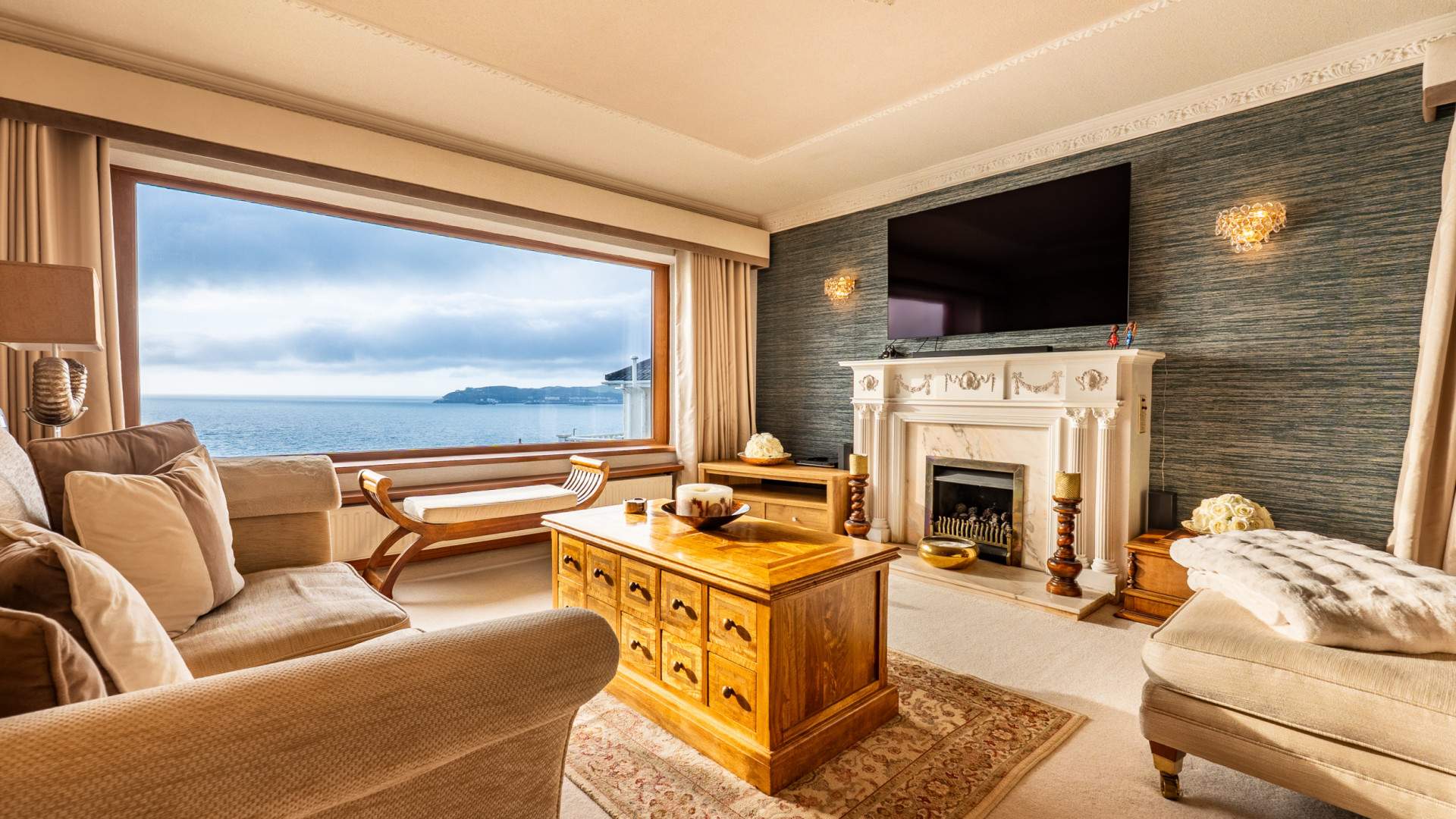 Outside, the home is framed by landscaped gardens designed for low‑maintenance enjoyment and year‑round appeal. The roof terrace, off the kitchen, offers an elevated vantage point to take in the sweeping sea views, perfect for entertaining.