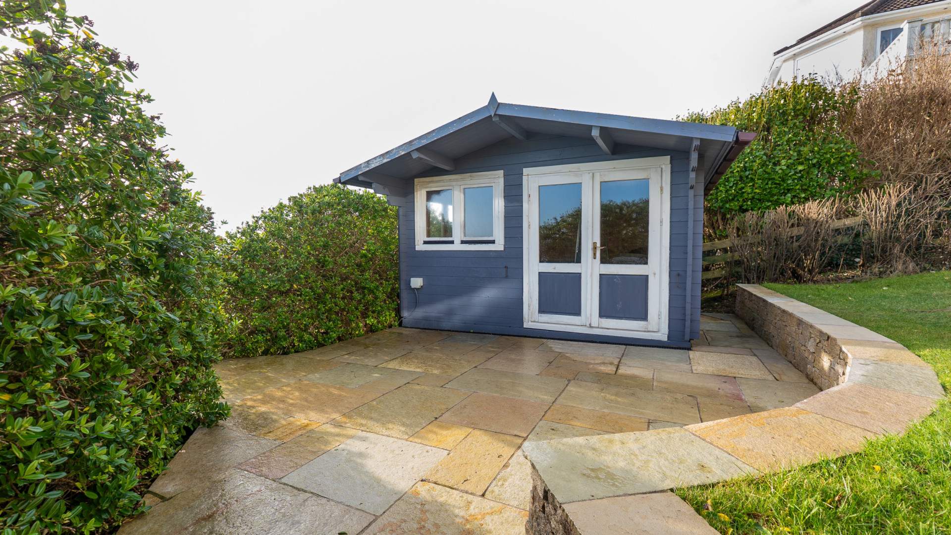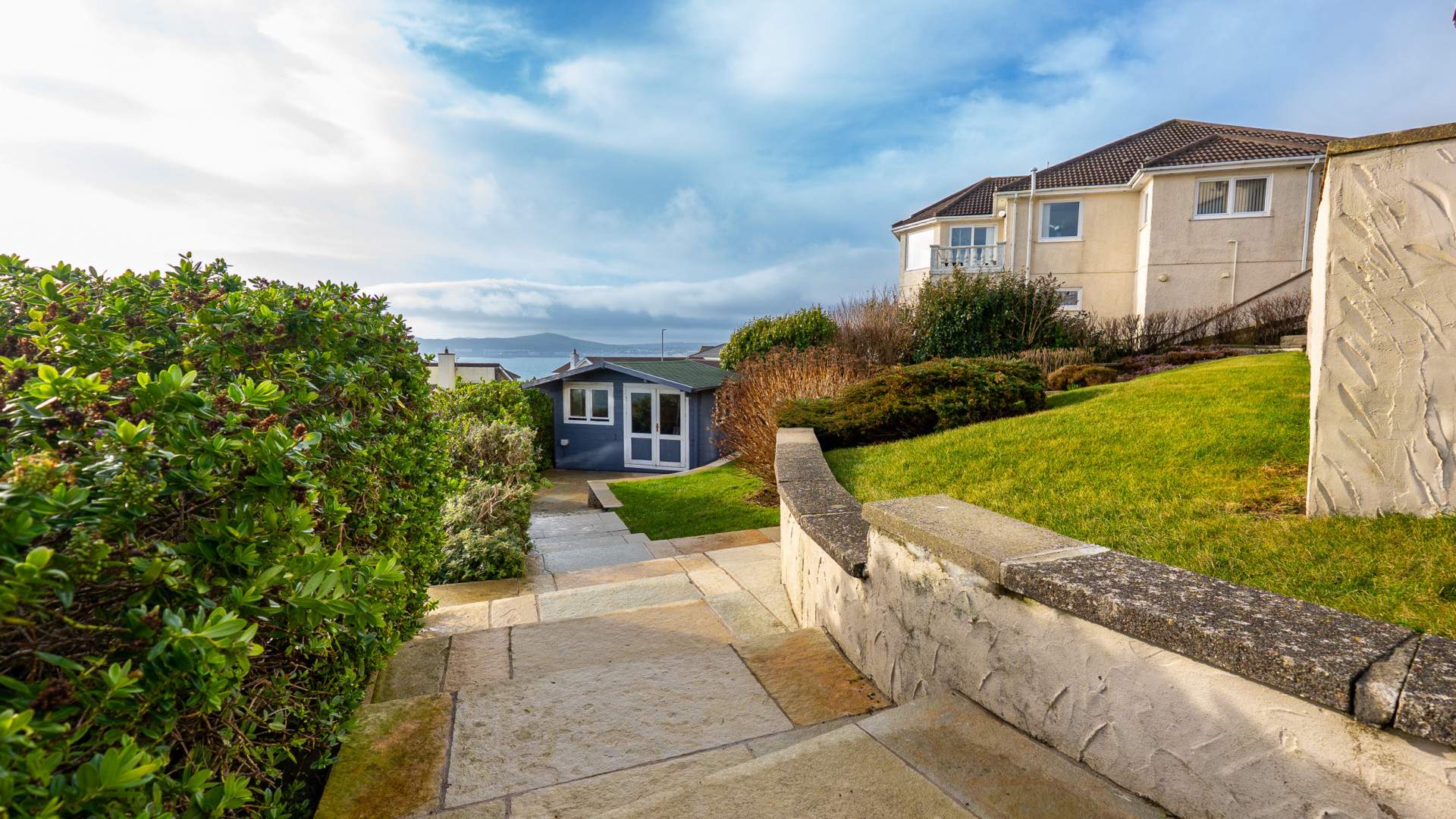 To the rear of the property there is a landscaped garden with tiered lawned areas and steps leading down to the summerhouse. Multiple mature shrubs and hedging.