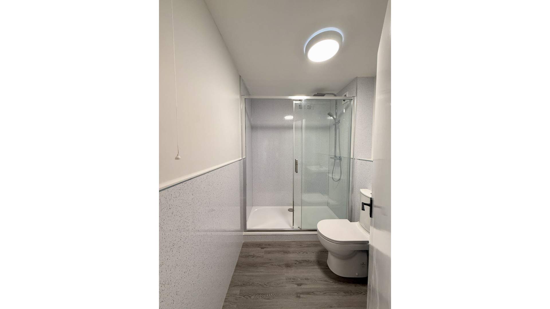 Modern spacious fitted bathroom suite comprising of a large walk in shower, WC and sink with a grey vanity unit below providing storage, The shower area if finished with mermaid board, with the remainder of the bathroom half painted and half mermaid board to all walls. The bathroom is finished with a ceiling light and grey vinyl flooring.