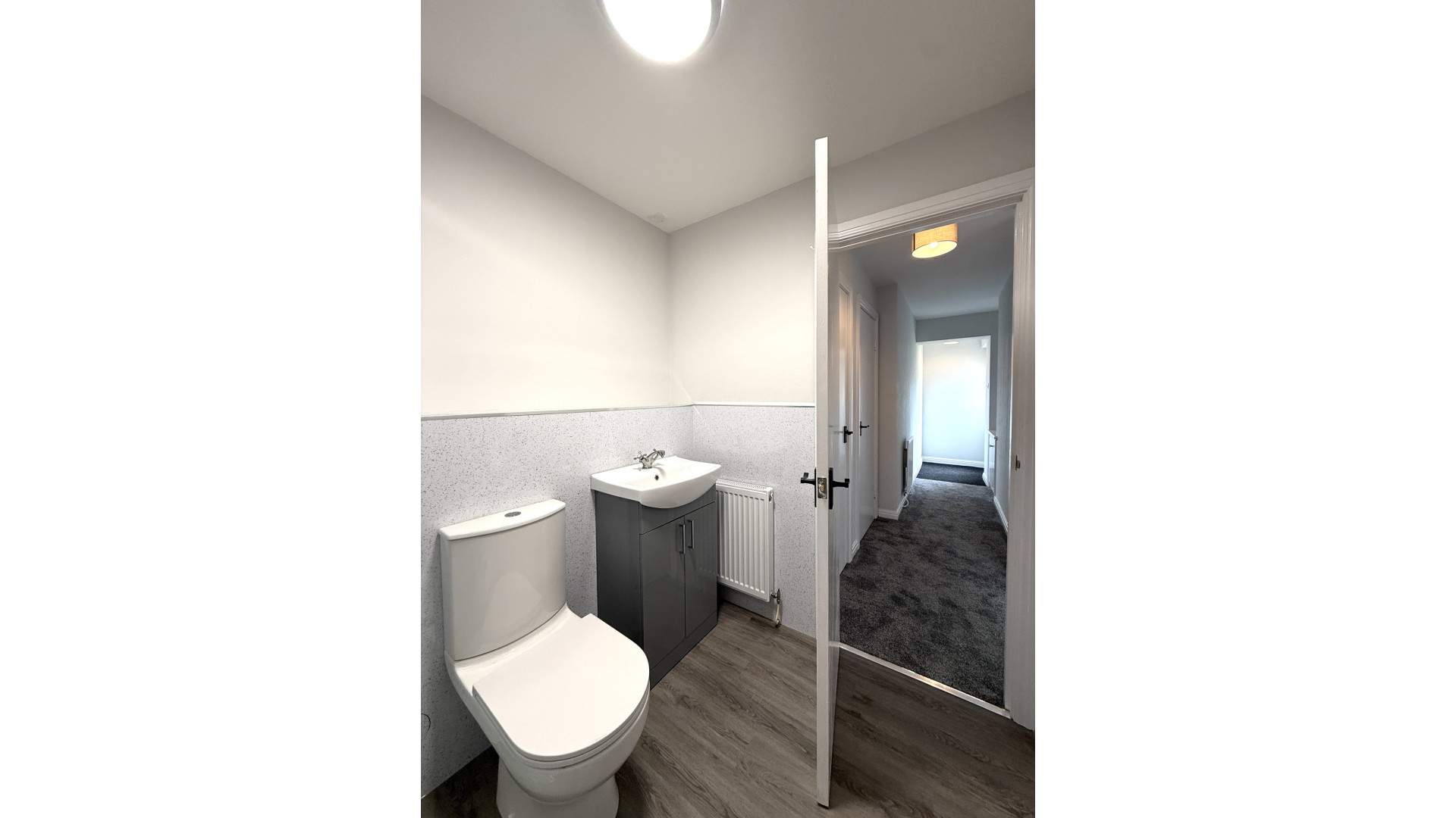 A light hallway with a uPVC double glazed door with 2 storage cupboards on the right handside and a small cupboard on your left at low level which houses the gas meter. The hallway has ceiling lights and carpeted flooring.
