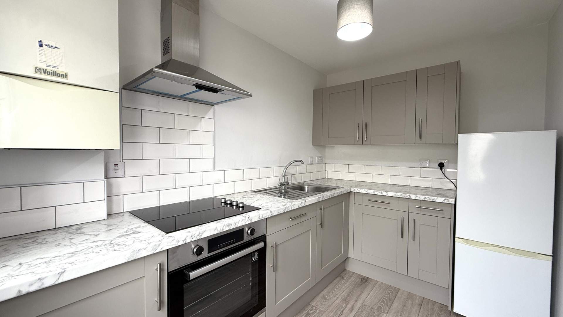 Well fitted kitchen comprising of grey floor and wall units, white worktop surfaces and tiled splash backs to two walls. There is an electric oven, standalone fridge freezer and fitted gas Vaillant combination boiler. The kitchen is finished with a centre ceiling light and grey vinyl flooring.