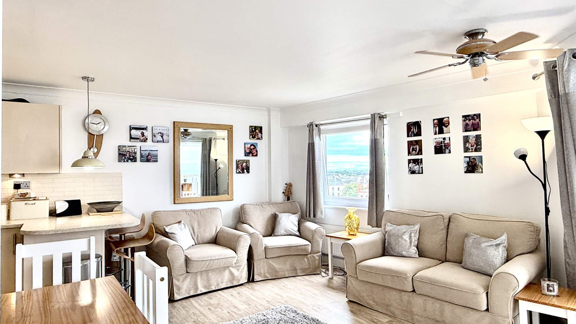 The kitchen area has an integrated fridge and freezer next to the sink with integrated slim line dishwasher, low level oven with ceramic hob above. Wall mounted cupboards above with under cupboard lighting, extractor fan above the hob, 2 ceiling lights. Wood effect vinyl flooring throughout. There are wonderful views across Ramsey beach, out to bride and over to the Swing Bridge through the uPVC double glazed window in the lounge area. The lounge area is finished with a ceiling fan and wood effect vinyl flooring throughout.