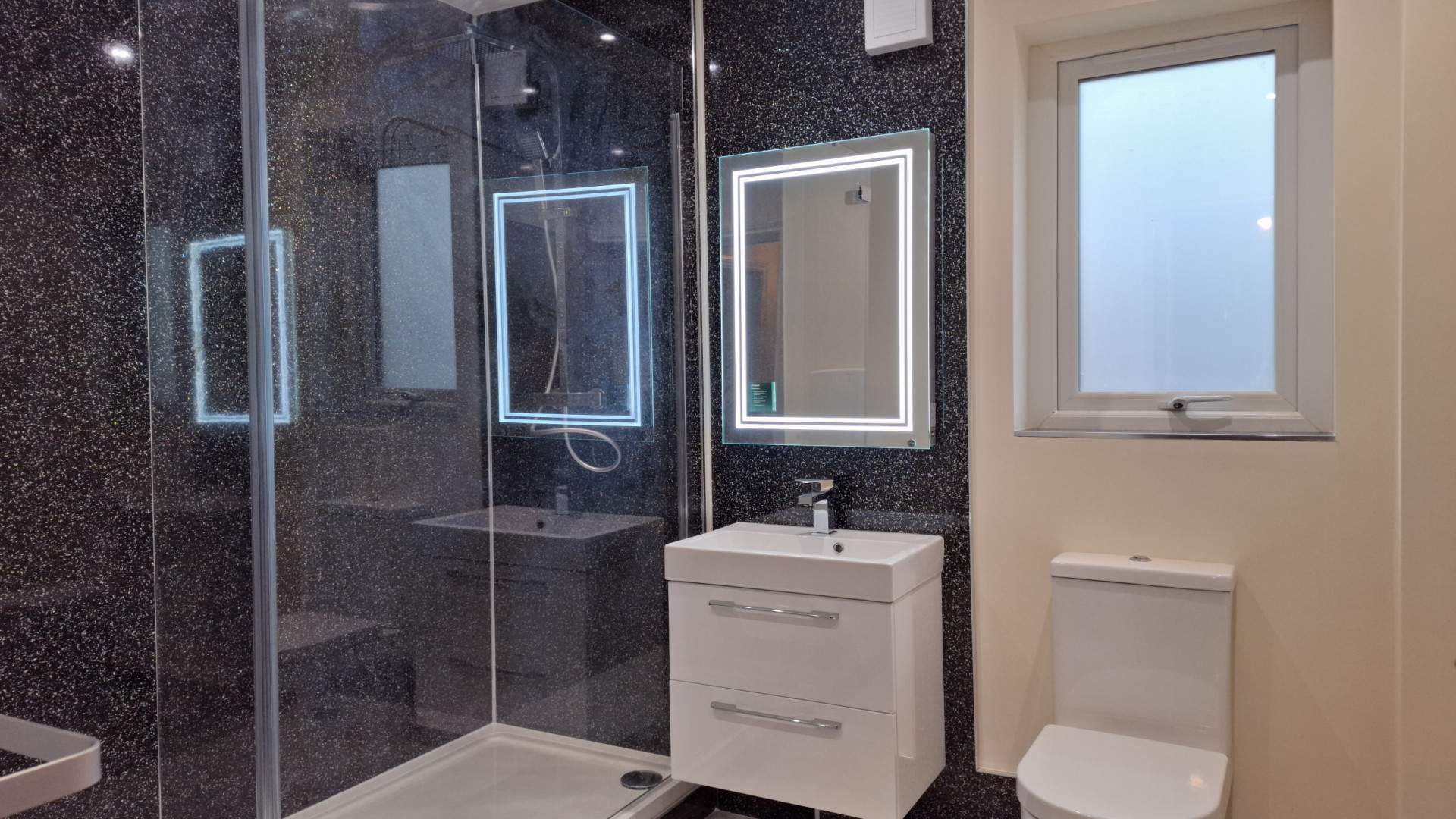 Spacious bathroom with a white 3 piece suite comprising of a WC and a wall hung sink with drawers below. There is a wall mounted mirror above the sink with sensor switch and splash back. The walk in shower has a large glass shower screen and the extractor fan on the ceiling above. The shower enclosure has mermaid board from the shower tray up to the ceiling on three sides. The bathroom is finished with recessed ceiling lights and laminate flooring throughout.