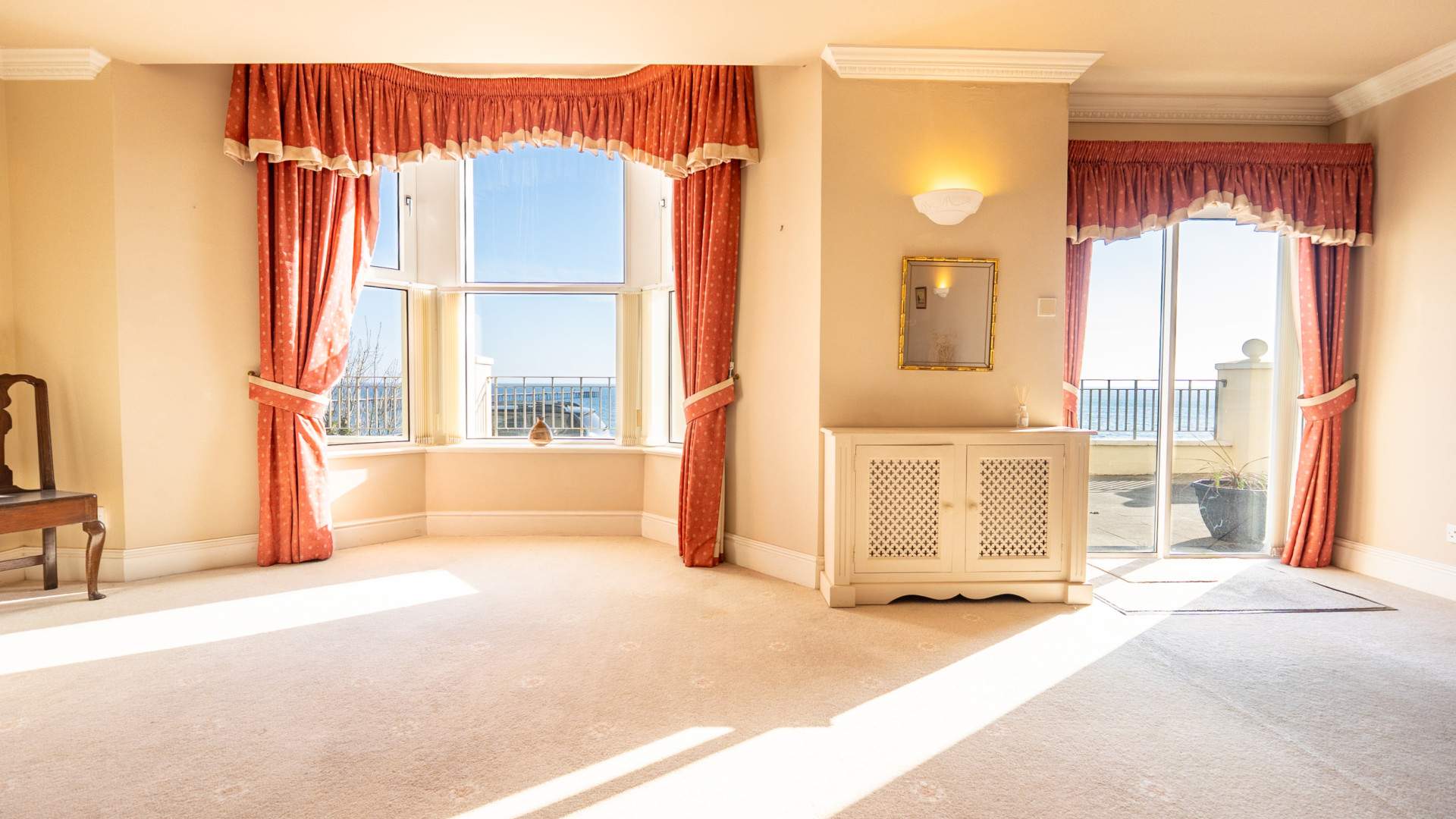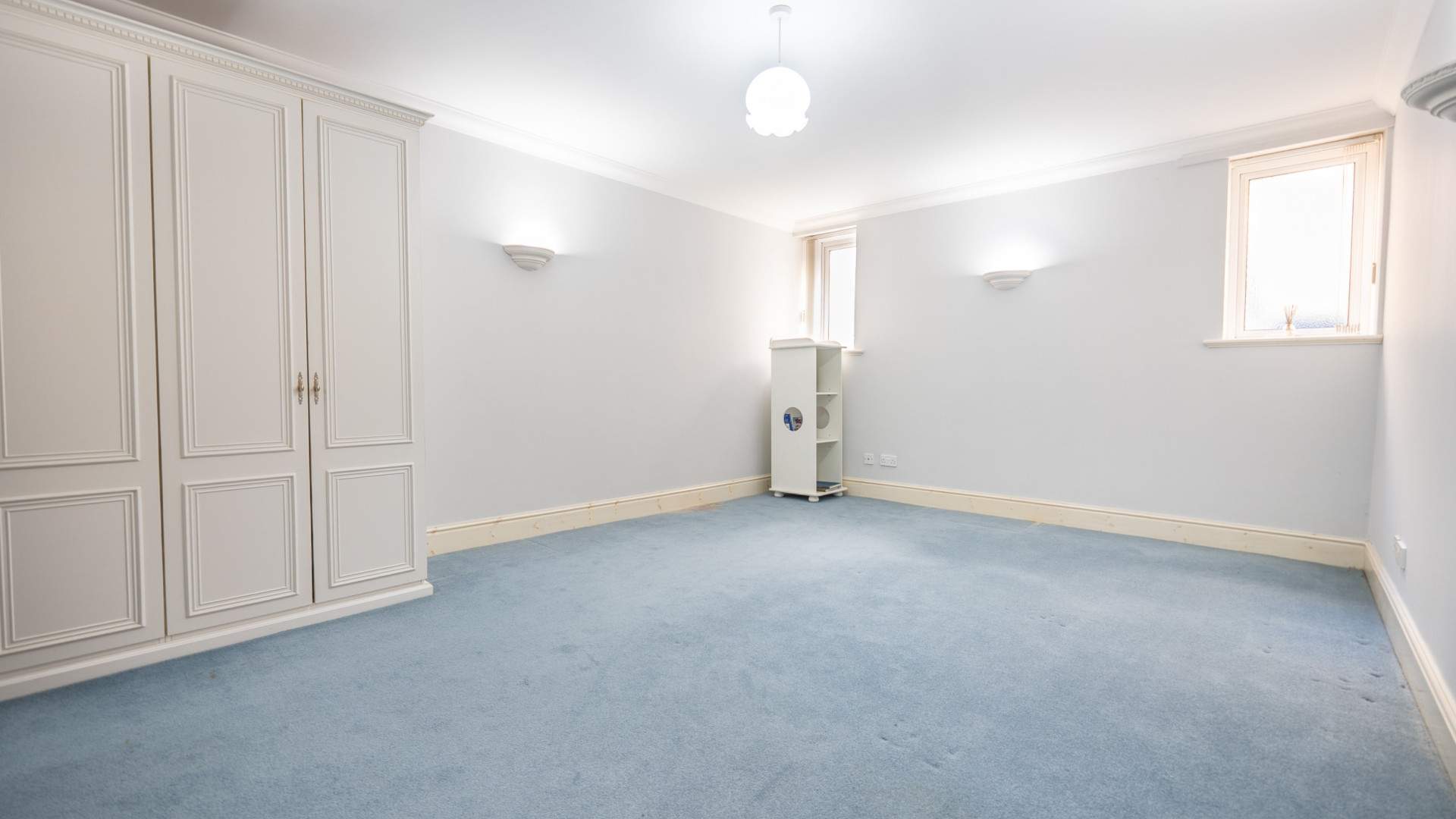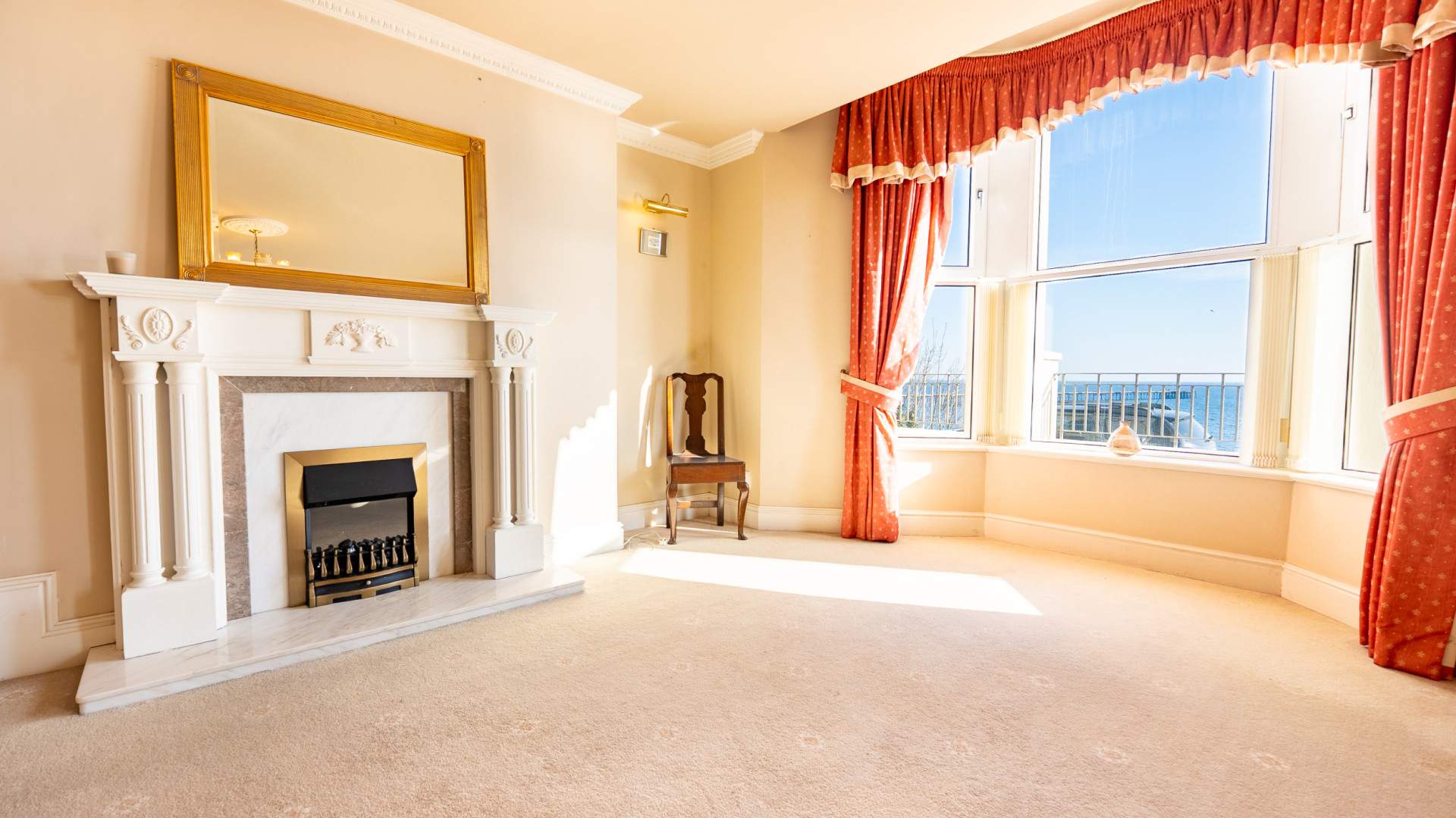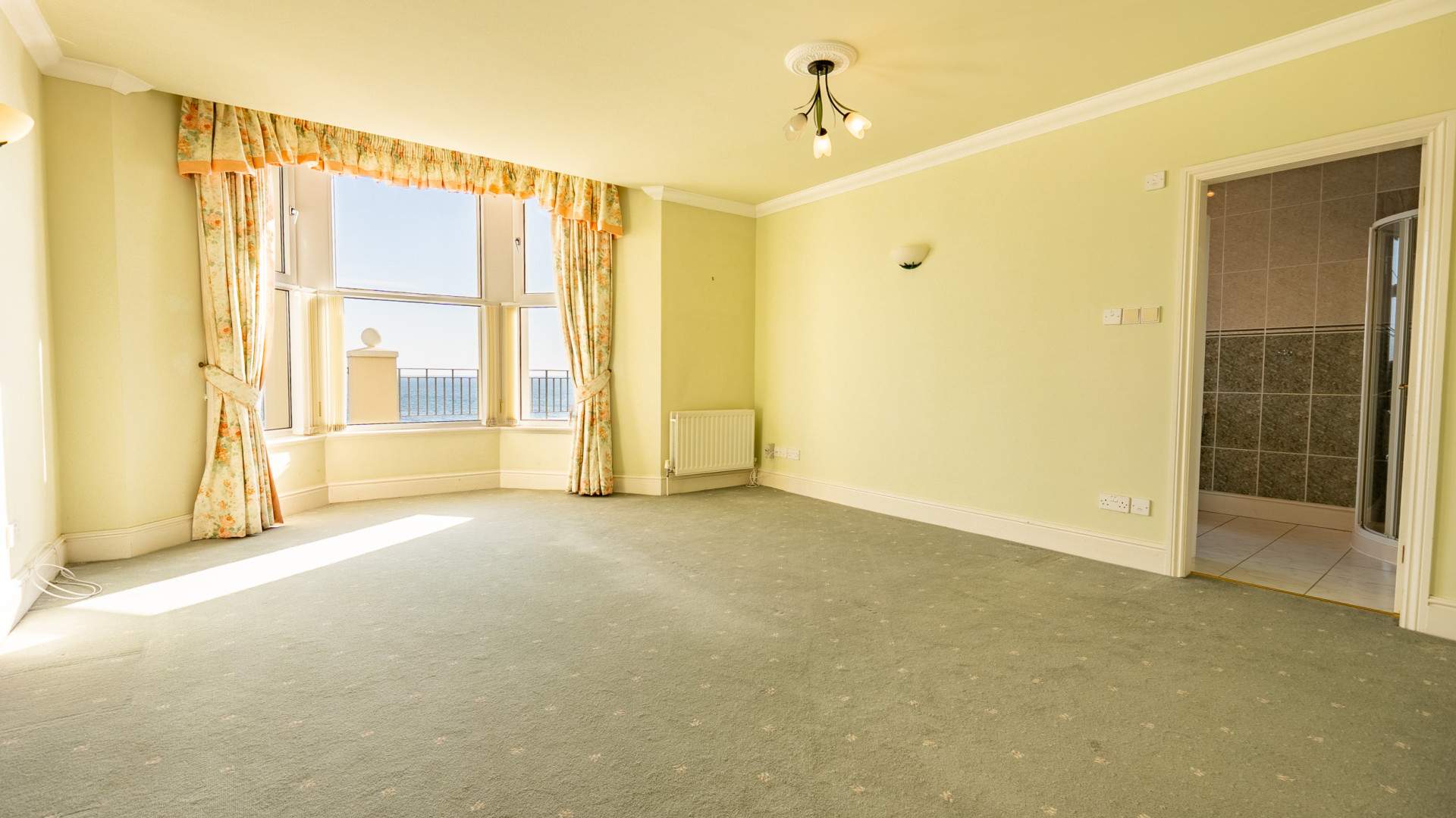 The very large double bedroom is accessed via an opening leading from the dressing room. A uPVC double glazed bay window to the front aspect of the property provides views to Ramsey Bay and the Queens Pier. The bedroom is finished with ceiling lights, wall lights and carpeted flooring.