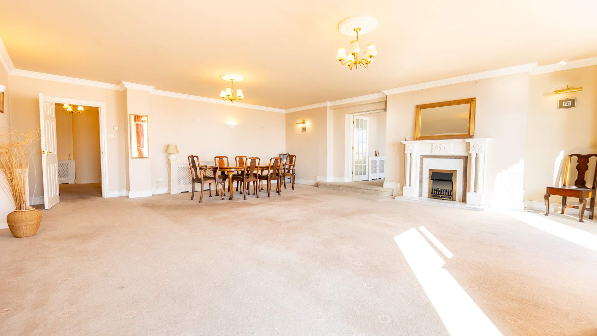 Expansive ground floor apartment with a spacious welcoming hallway, large kitchen/diner & substantial lounge which accesses the extensive secure patio. 3 Large bedrooms, 2 are ensuite, and a sizeable dressing room. 2 Parking spaces, 1 in the communal integral garage. Large private store room & shared storage in the basement. Pets allowed. No onward chain.