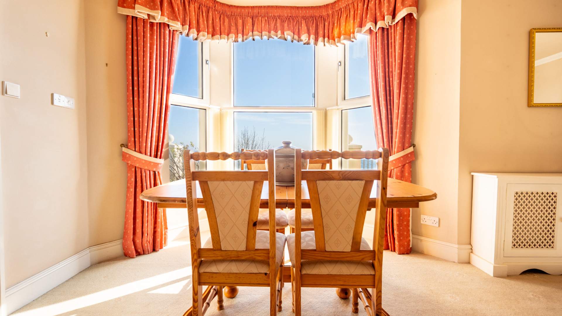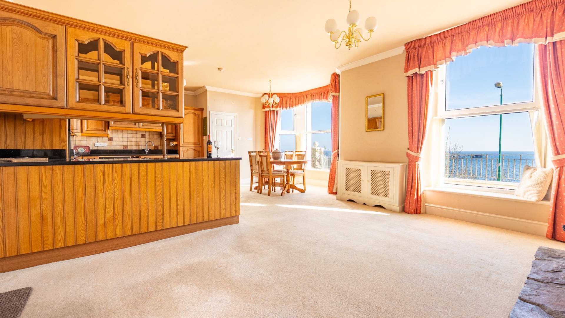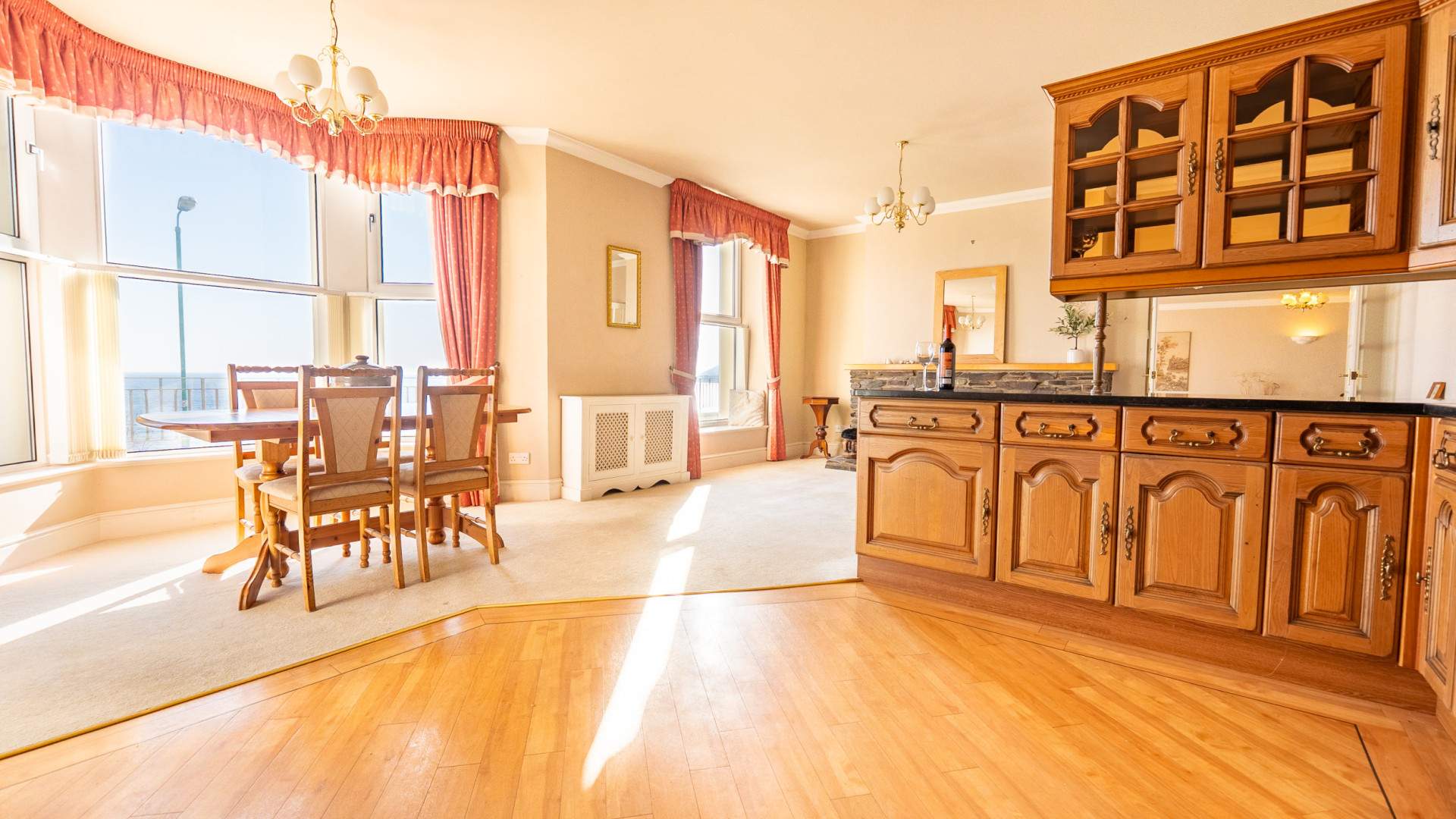Spacious kitchen with seating area in front of a bay window with uPVC double glazed windows which provide views of Ramsey Harbour to Port Lewaigue and Bride. The spacious seating area by the bay window allows you to take in the constantly changing views and sea conditions. The kitchen area has floor and wall mounted cupboards with ample worktop space and under cupboard ambient lighting. There is a 4 ring gas hob with extractor fan above, two ovens and integrated wine rack. In addition there is a Franke sink and a half with drainer, an integrated Neff dishwasher and under the counter integrated fridge and freezer. Along the same wall with the sink is a storage cupboard containing the pressurised hot water tank and gas boiler. The kitchen area has wood effect laminate flooring and the remainder of the room is carpeted.