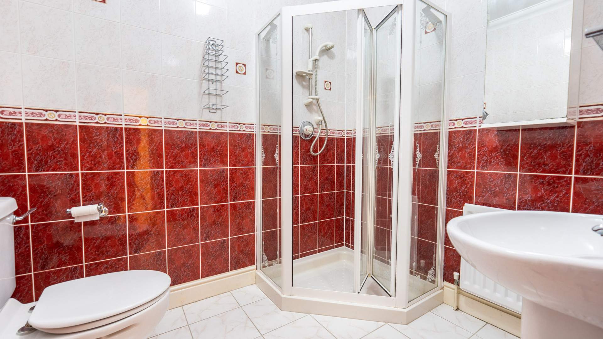 Large bathroom in between bedroom two and the utility with a three piece suite comprising a WC, pedestal sink and a large corner shower. The bathroom is finished with ceiling lights and tiled flooring.