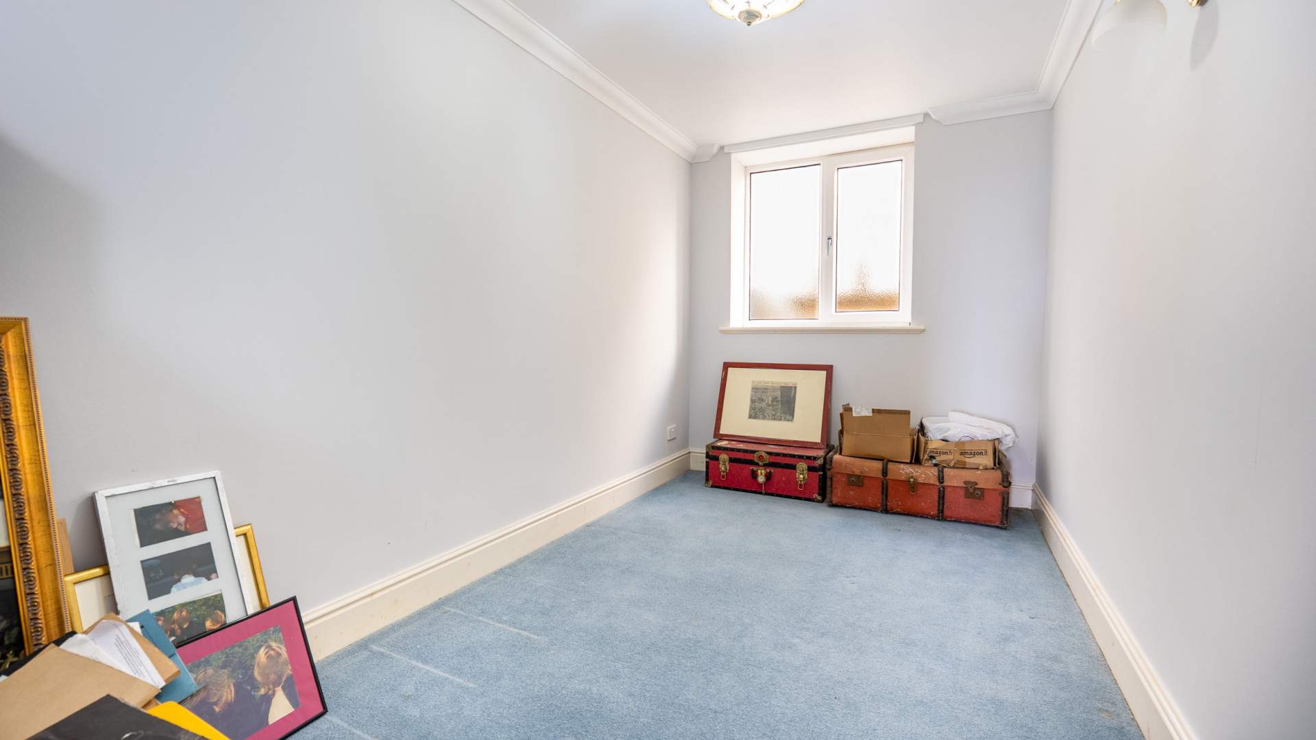 Large store room with two uPVC double glazed frosted windows looking on to the side aspect of the building. There is lighting and power in the room which has a concrete floor.