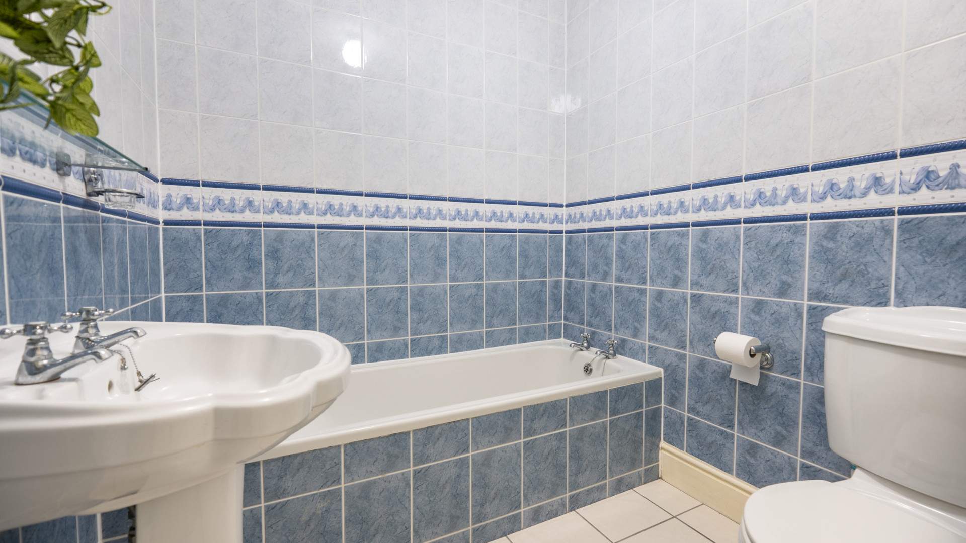 A further spacious bathroom with a three piece suite comprising of a bath, pedestal sink and WC. The bathroom is finished with ceiling lights and tiled flooring.