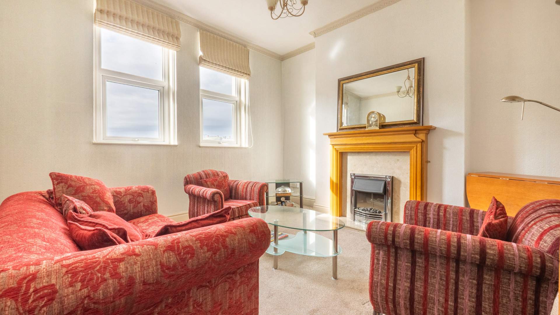 Electric fireplace with wooden surround and marble hearth. uPVC double glazed window overlooking the front of the property with views over Douglas and up to Douglas Head.