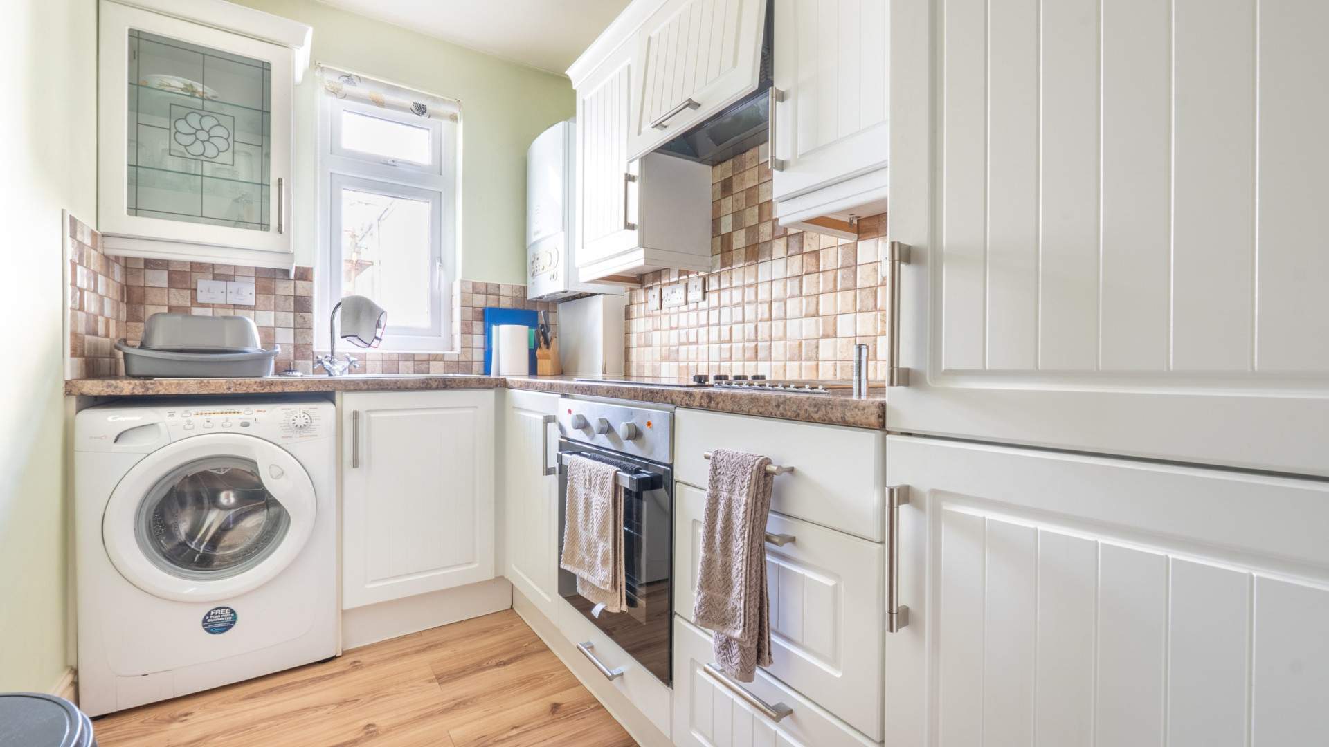 Fitted with a range of base, wall and drawer units. Stainless steel sink and drainer. Built-in electric oven and induction hob with extractor hood above. Built-in fridge/freezer and space for a washer/dryer.
