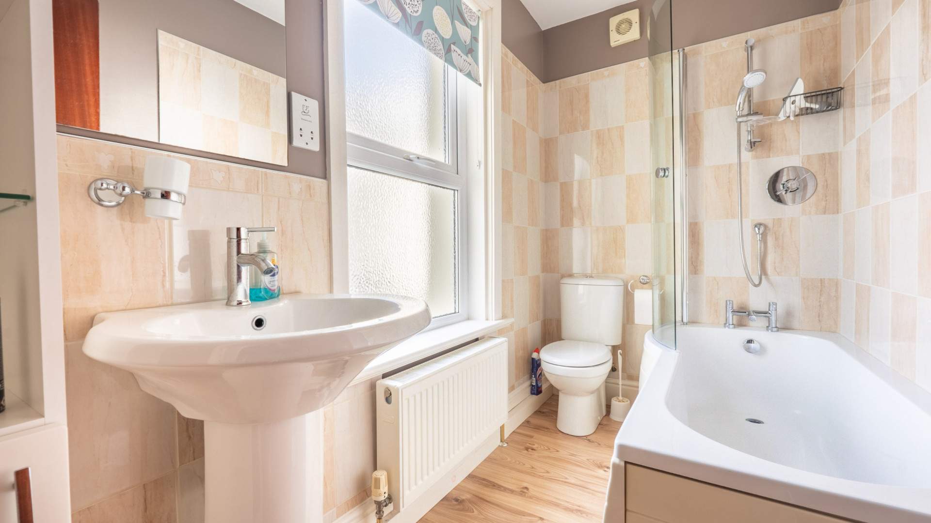 Fitted with a three piece suite comprising of a bath tub with shower attachment over, wash hand basin and W.C. Frosted uPVC window. Chrome heated towel rail. Extractor fan.