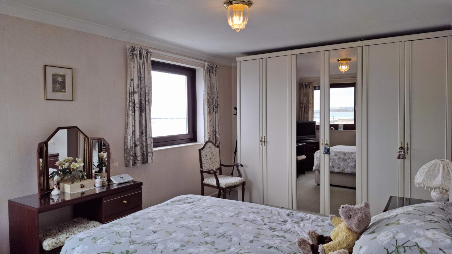 Located to the right of the hallway is a spacious bright double bedroom with two uPVC double glazed windows. One window provides views across Ramsey bay across to Bride, the second window provides views across the bay of the Queens Pier and on to Port Lewaigue beach. There is a built-in triple wardrobe with three sets of double doors, two doors are mirror fronted. The room is finished with a ceiling light and carpeted flooring throughout. A door on your right when entering the bedroom leads to: