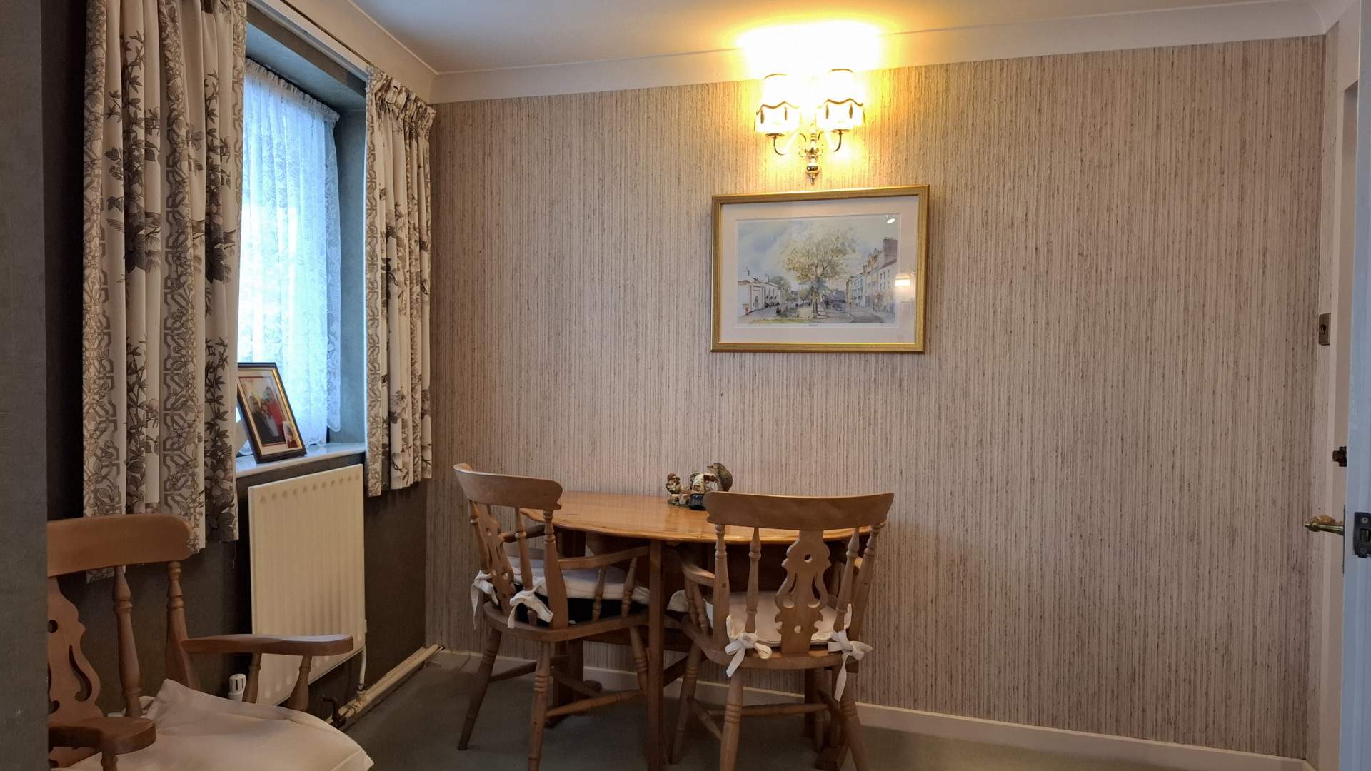 The dining area of the lounge has a double-glazed wooden window which opens on to the enclosed balcony. There are two wall lights and carpeted flooring which flows into the lounge area of the room.