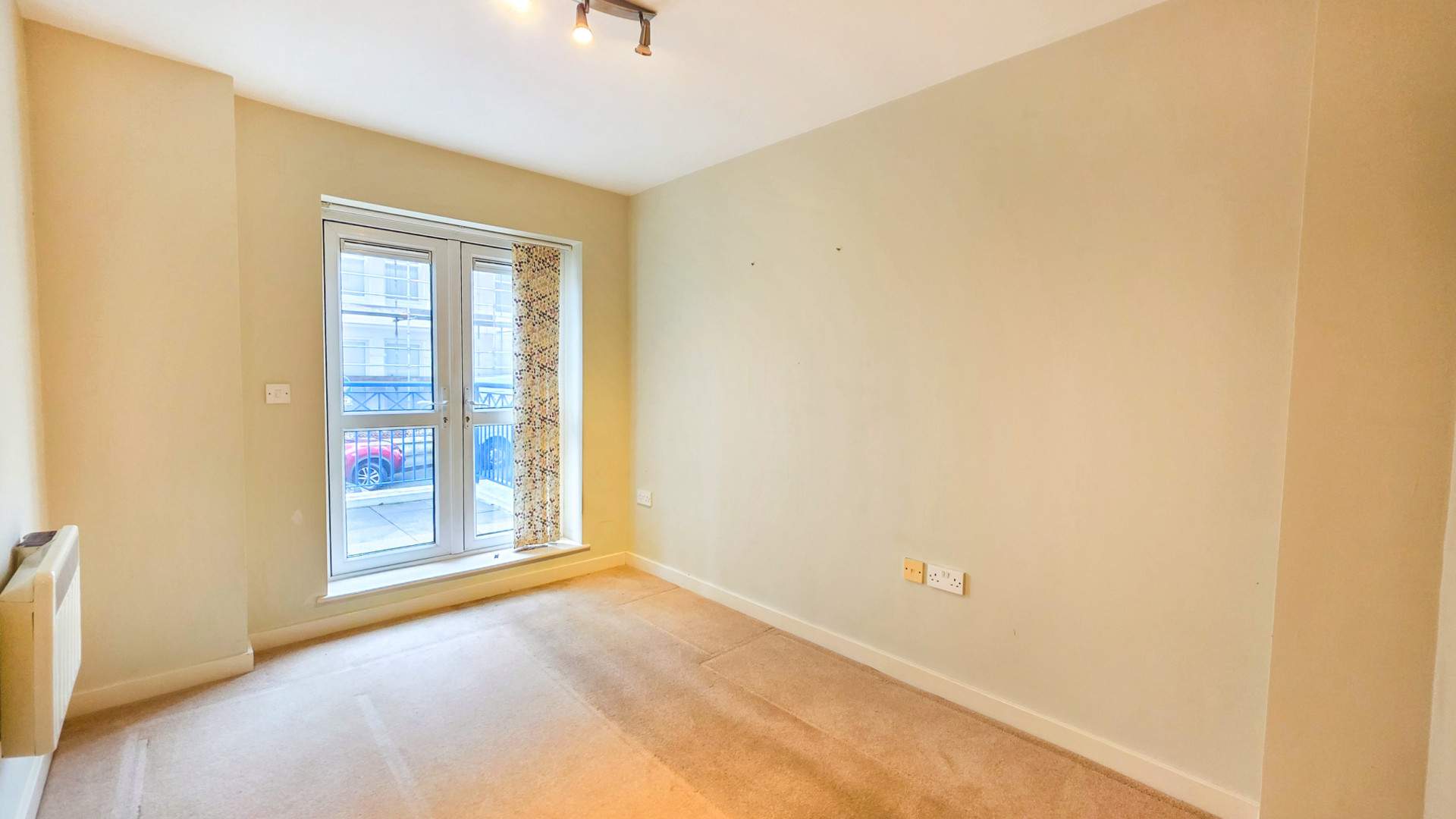 - Bedroom (approx. 10’7 x 10’3): Set of double doors opening out onto: